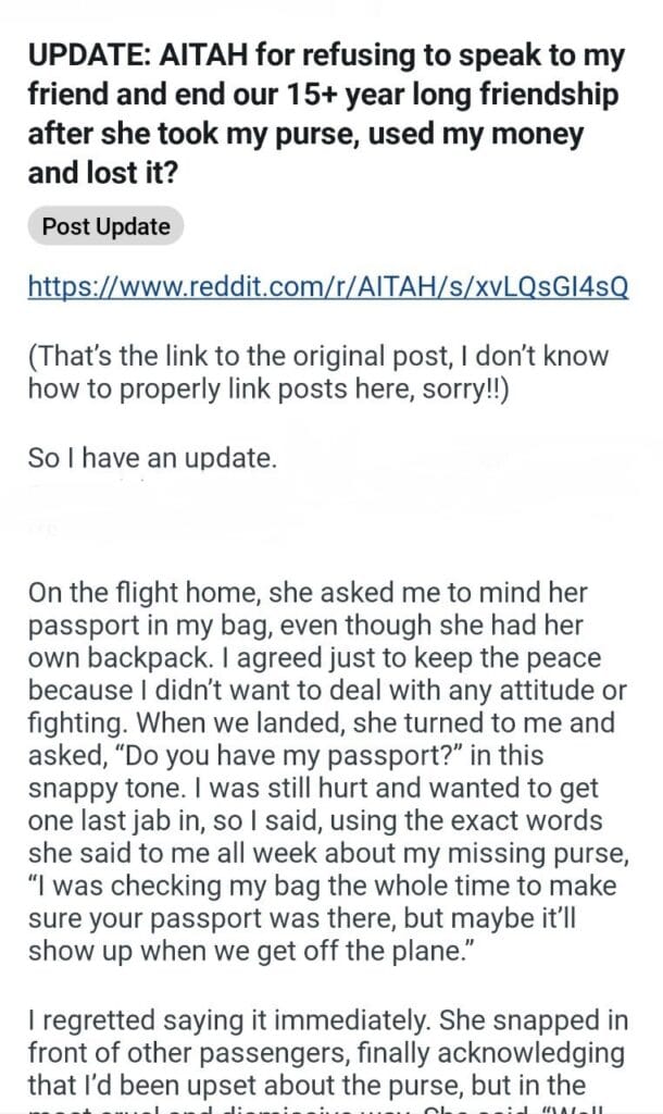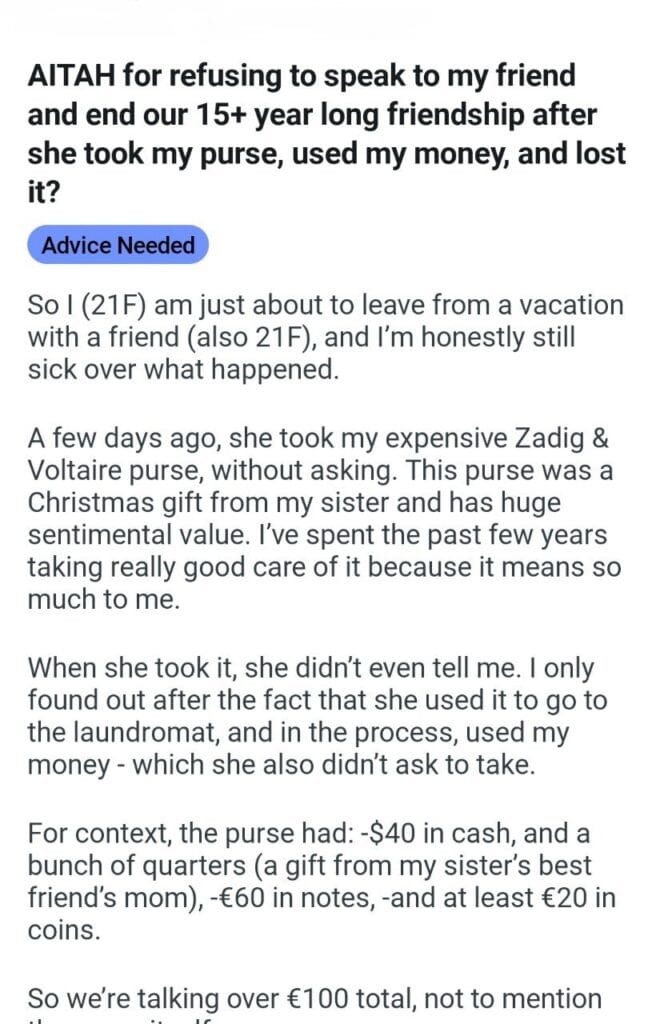 15+ year long friendship ***UPDATE Related Posts the money my husband took talking to a girl AITA for telling the family a won gift on myself telling her and my brother my son my grandmother’s ring my sister for her kids my husband ultimatum share with a coworker renting an apartment with my boyfriend my dad’s old house AITA for how I reacted AITA for telling my son AITA? Mom thinks she’s he didn’t do anything