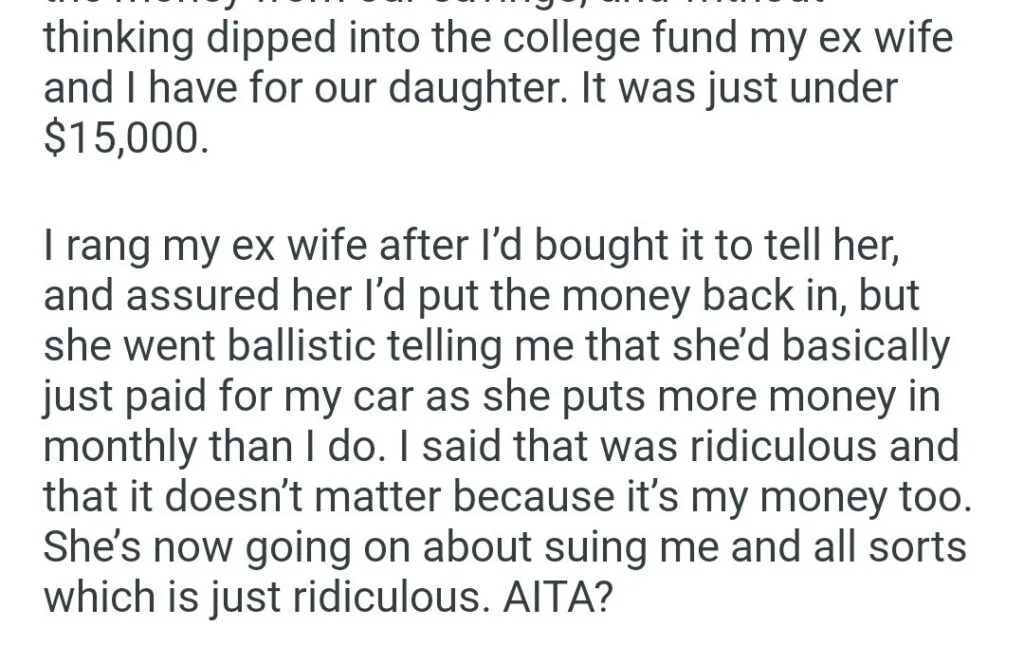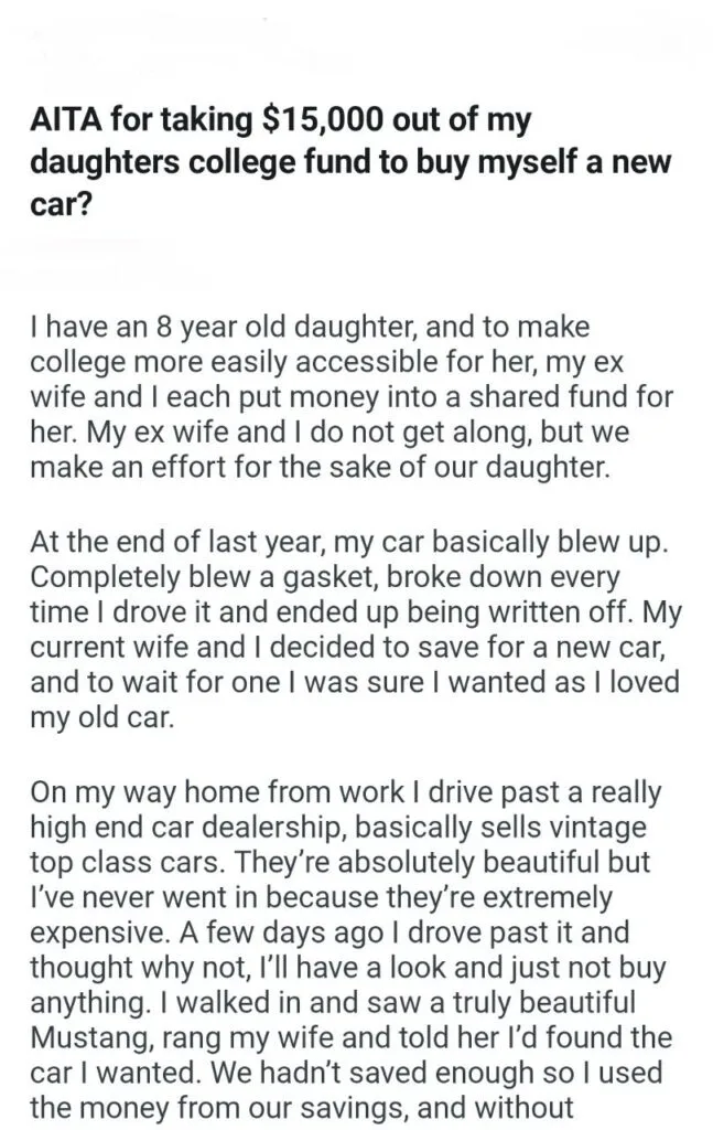 15,000 out of my daughters college fund Related Posts deciding to separate our finances my sister to babysit HOA is asking us my in-laws to respect my way my dog’s puppies’ vet bills a child with my girlfriend my friend stay in my second property my parents marriage by finding my bio father Because I’m the woman AITAH for telling my BIL that helping I didn’t AITA for demanding my colleagues my GF’s phone AITAH for telling my SIL daughter lives for free with us