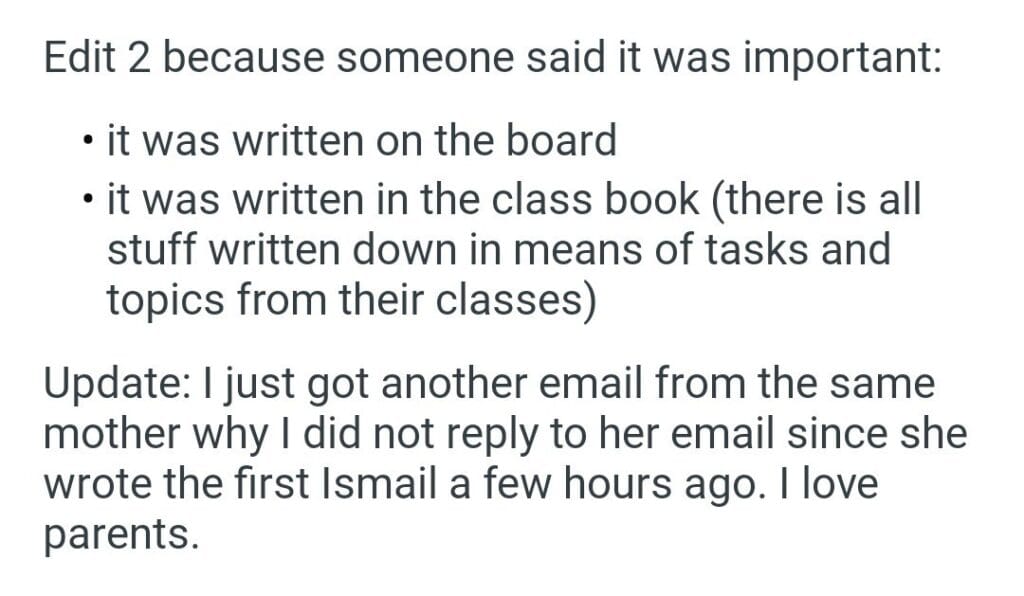 31 students Related Posts my partner’s early birthday put my girlfriend my 16yro son eighth baby he went through my phone picture of my husbands wife he expects me to contribute the child my ex-wife had trying to test what I told her my son’s account quiz show my son’s account my son phone AITAH for telling my cousin