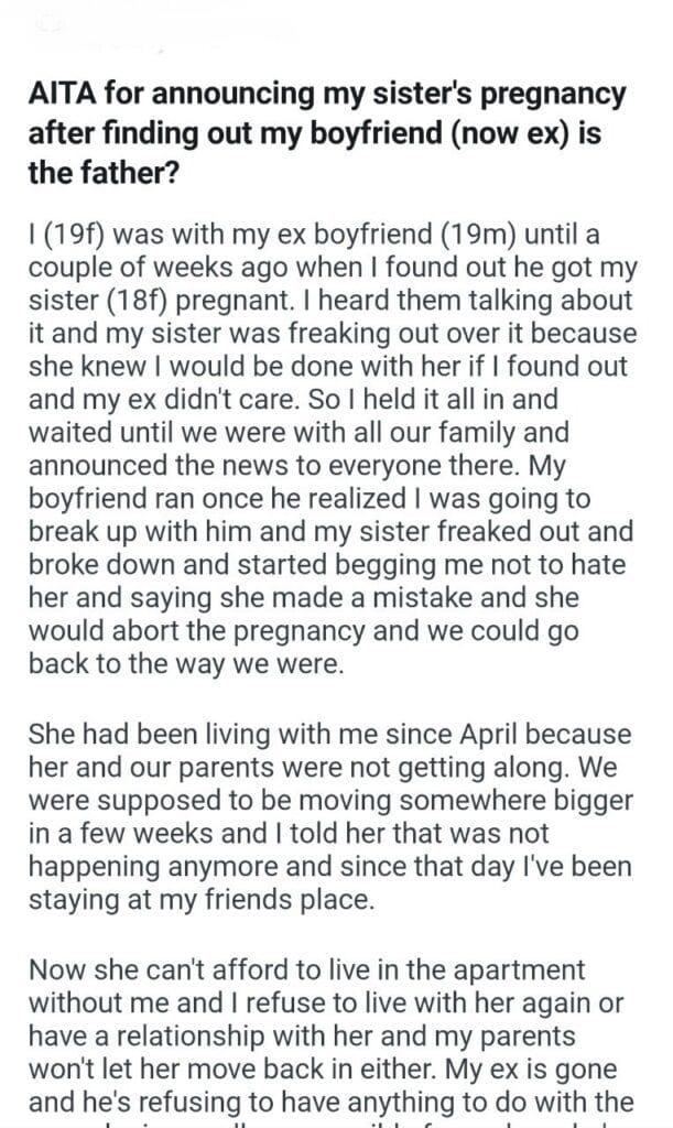 AITA for announcing my sister’s pregnancy Related Posts my dog’s puppies’ vet bills a child with my girlfriend my friend stay in my second property my parents marriage by finding my bio father Because I’m the woman AITAH for telling my BIL that helping I didn’t AITA for demanding my colleagues my GF’s phone AITAH for telling my SIL daughter lives for free with us AITA for changing the wedding venue my fiancé her parent can’t live with us my husband’s friend to stay in our house picking her up at the airport at 3AM
