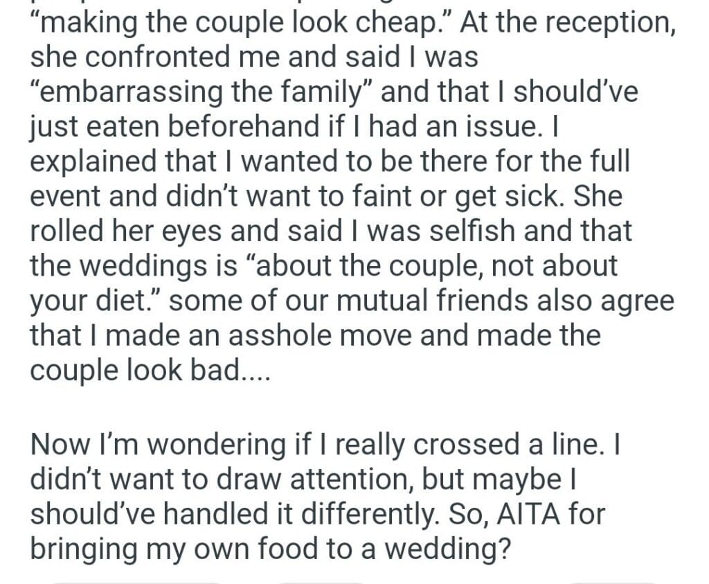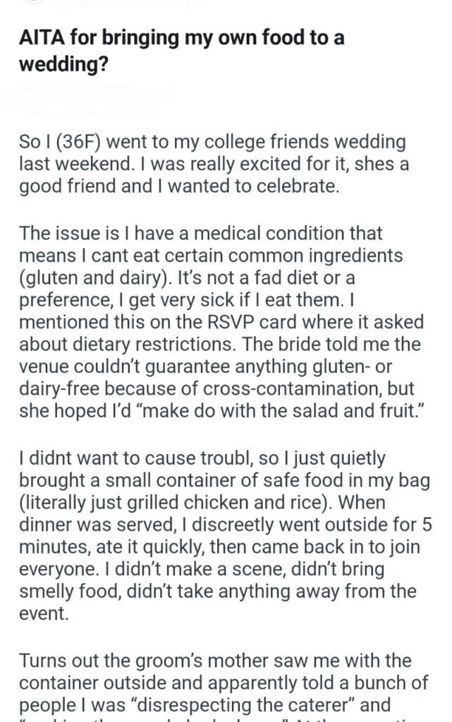 AITA for bringing my own food Related Posts AITA for telling gf we’re either staying in hotel Should I let my boyfriend move in? AIO My ex-wife and her new husband AITA for wanting to move abroad my puppy my bf bought teenager parents want to settle privately remake a gift for my friend she keeps wishing our kids had my features WIBTA if I don’t tell my dad my husband and MIL out for being too heavy a sleeper he’ll have to explain to why to her my step-sister borrow my wedding dress I refused because I have two small children. AITAH? what he did to me during my pregnancy