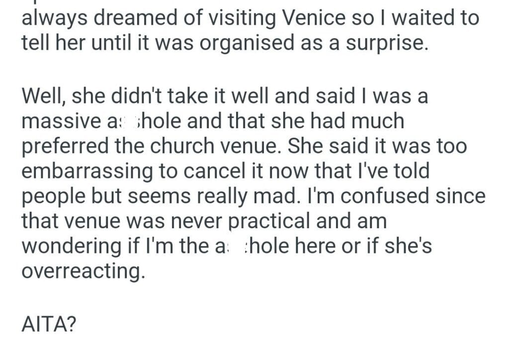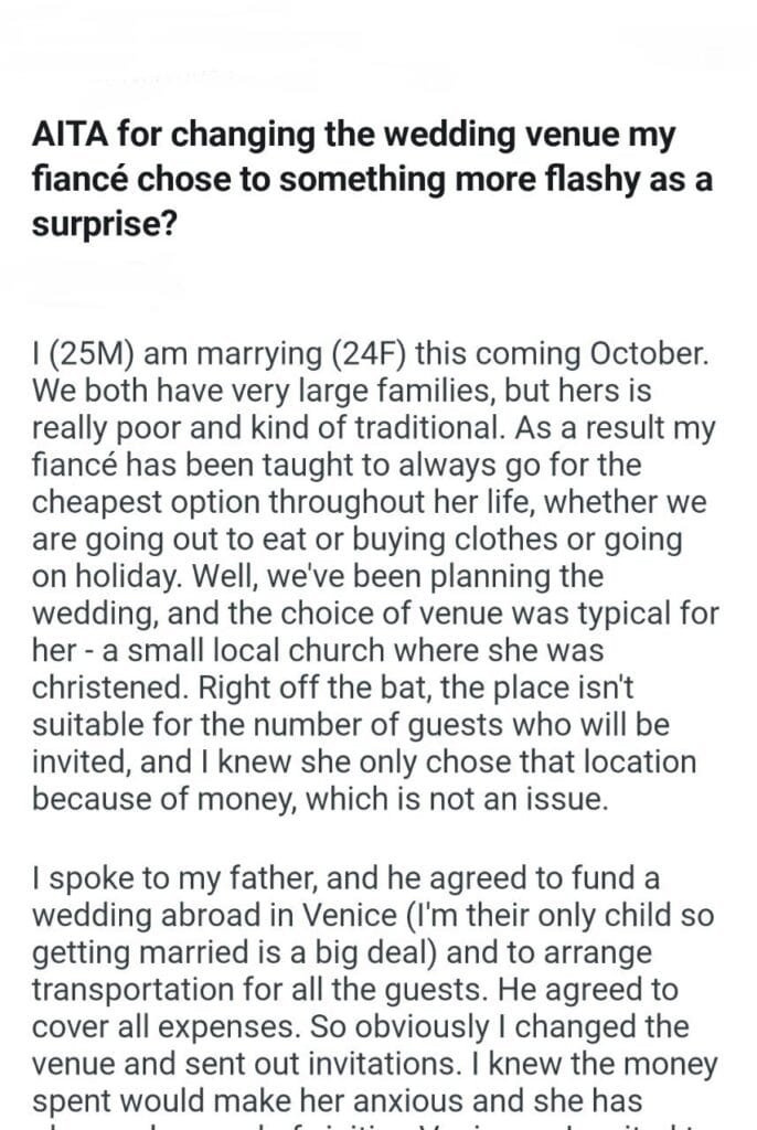 AITA for changing the wedding venue my fiancé Related Posts AITAH for telling my BIL that helping I didn’t AITA for demanding my colleagues my GF’s phone AITAH for telling my SIL daughter lives for free with us her parent can’t live with us my husband’s friend to stay in our house picking her up at the airport at 3AM my bf over Mariokart what my neighbor did my Dad and his wife after they refused my girlfriends wigs my GF did and asking for space AITA for expecting