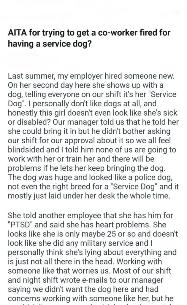 AITA for co-worker service dog? Related Posts present for a baby family trip right after when my husband asks me my MIL from my wedding my stepkids accounts with my little sister my stepdaughter suggestion taking the kids to my parents my wife of 20 years My Cousin video My 24F husband 26M my stepkids that my kids AITA- I called my sis my cousin to announce her pregnancy my girlfriends dogs