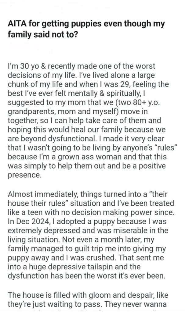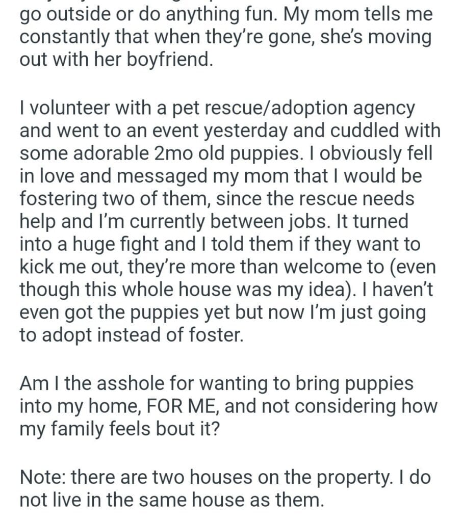 AITA for getting puppies Related Posts AITAH for telling my BIL that helping I didn’t AITA for demanding my colleagues my GF’s phone AITAH for telling my SIL daughter lives for free with us AITA for changing the wedding venue my fiancé her parent can’t live with us my husband’s friend to stay in our house picking her up at the airport at 3AM my bf over Mariokart what my neighbor did my Dad and his wife after they refused my girlfriends wigs my GF did and asking for space