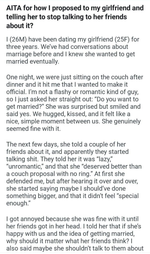 AITA for how I proposed to my girlfriend Related Posts my dog’s puppies’ vet bills a child with my girlfriend my friend stay in my second property my parents marriage by finding my bio father Because I’m the woman AITAH for telling my BIL that helping I didn’t AITA for demanding my colleagues my GF’s phone AITAH for telling my SIL daughter lives for free with us AITA for changing the wedding venue my fiancé her parent can’t live with us my husband’s friend to stay in our house picking her up at the airport at 3AM