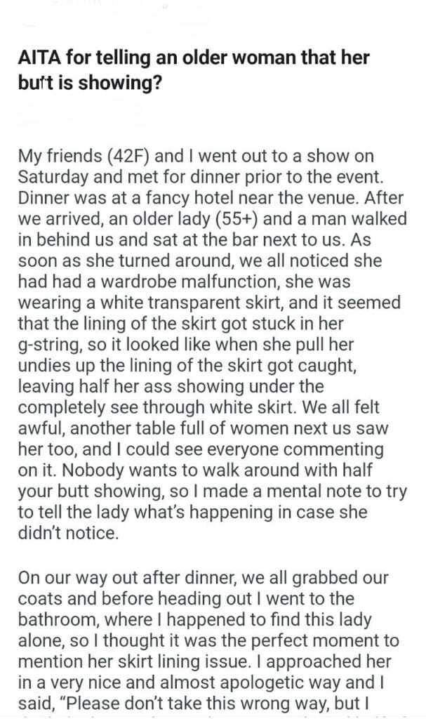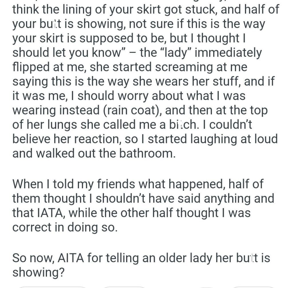 AITA for telling an older woman Related Posts AITAH for telling my BIL that helping I didn’t AITA for demanding my colleagues my GF’s phone AITAH for telling my SIL daughter lives for free with us AITA for changing the wedding venue my fiancé her parent can’t live with us my husband’s friend to stay in our house picking her up at the airport at 3AM my bf over Mariokart what my neighbor did my Dad and his wife after they refused my girlfriends wigs my GF did and asking for space