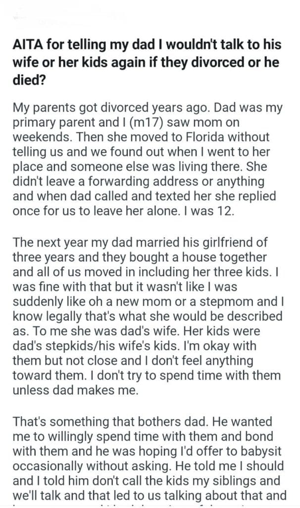 AITA for telling my dad Related Posts my dog’s puppies’ vet bills a child with my girlfriend my friend stay in my second property my parents marriage by finding my bio father Because I’m the woman AITAH for telling my BIL that helping I didn’t AITA for demanding my colleagues my GF’s phone AITAH for telling my SIL daughter lives for free with us AITA for changing the wedding venue my fiancé her parent can’t live with us my husband’s friend to stay in our house picking her up at the airport at 3AM
