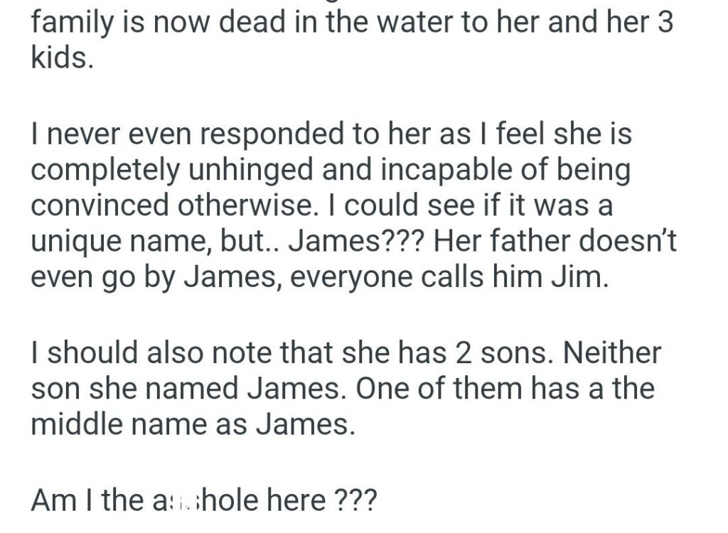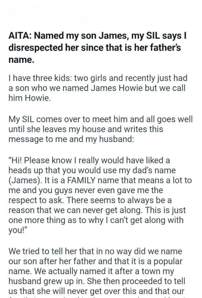 AITA: Named my son Related Posts my baby middle name 10 days before the wedding Mil’s at my wedding my step-son’s college fund on a hike the concert ticket I bought my friendĀ AITA for telling my future sister in law Thanksgiving Halloween or Christmas this year for getting a dog my workout routine Boyfriend doesn’t want to proposeĀ My (24F) BF (27M) booked our tickets trip because my friend my boyfriend (34M) he can give his kid’s mother a ride
