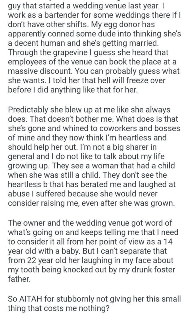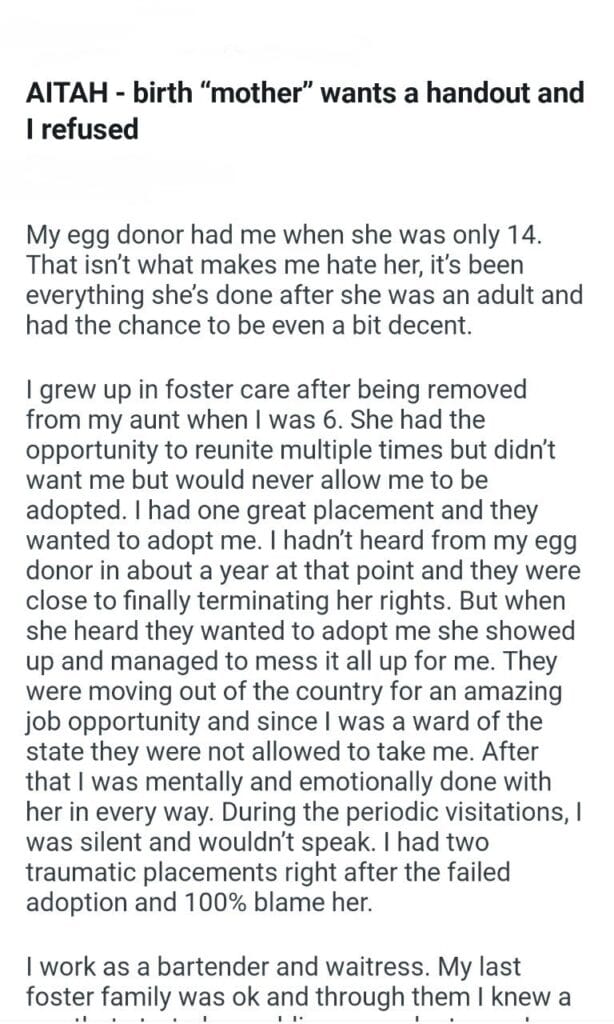 AITAH – birth “mother” *****UPDATE Related Posts I told my roommates I wanted to try for being fat sleep in the same bed as my wife passing on an “heirloom” to my daughter in law extra food on my plate she “didn’t mean to”? AITAH for telling my friend/colleague someone else’s meal our neighbors use our driveway My wife said something my ex (19F) and now I (19M) my partner everyday my GFs worldview my father’s stepkids AITA for telling my mil