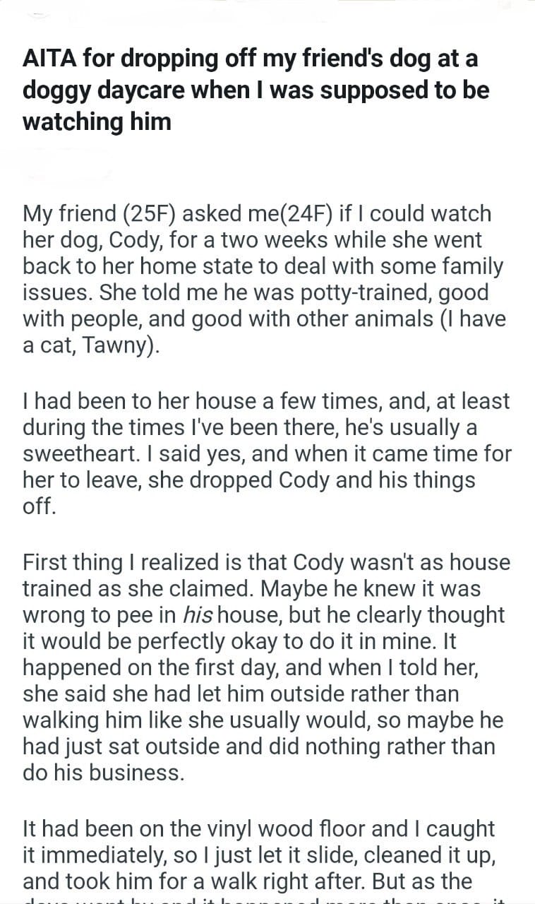Aitah for helping a client Related Posts my friend’s dog my wedding guests refinance the car he left me something she gave away my work hours listen to my husband my wife’s pregnancy my cousin for a “prank” dog for my Daughter reporting a teacher my property for not speaking Call Animal Control my bathroom sister of my father’s not judgement