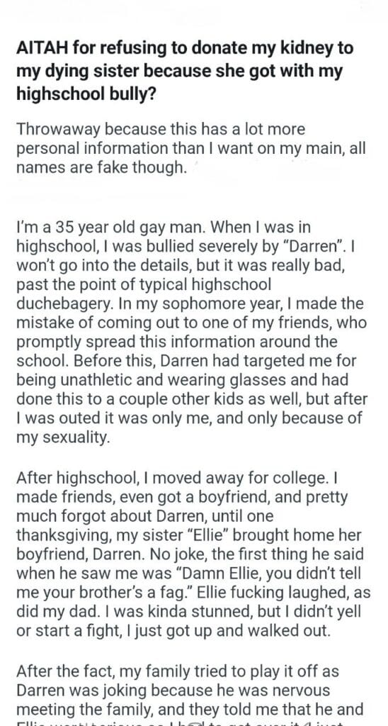 AITAH for refusing to donate Related Posts his ex wife babysit my husbands kids go to Christmas Dinner my boyfriend’s family Thanksgiving My husband (36M) my best friend of 20 years another kid My Dad’s Christmas his wedding speech her and her children my sister and her husband my purpose my ex-wife again female “friend” kids she had kids