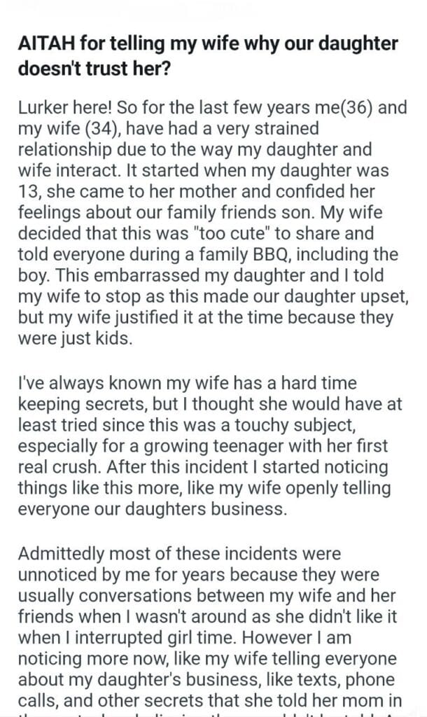 AITAH for telling my wife why Related Posts my girlfriend’s birthday AITA for telling my roommate my gf for having AITA for saying my wife my childcare job I told my friend why for how I handled AITAH for asking MIL AITA for wanting to divorce my husband for responding to a SIL’s my husbands birthday weekend my fiancée tattoo with my sister my(m29) girl friend (f28) my husband’s newly