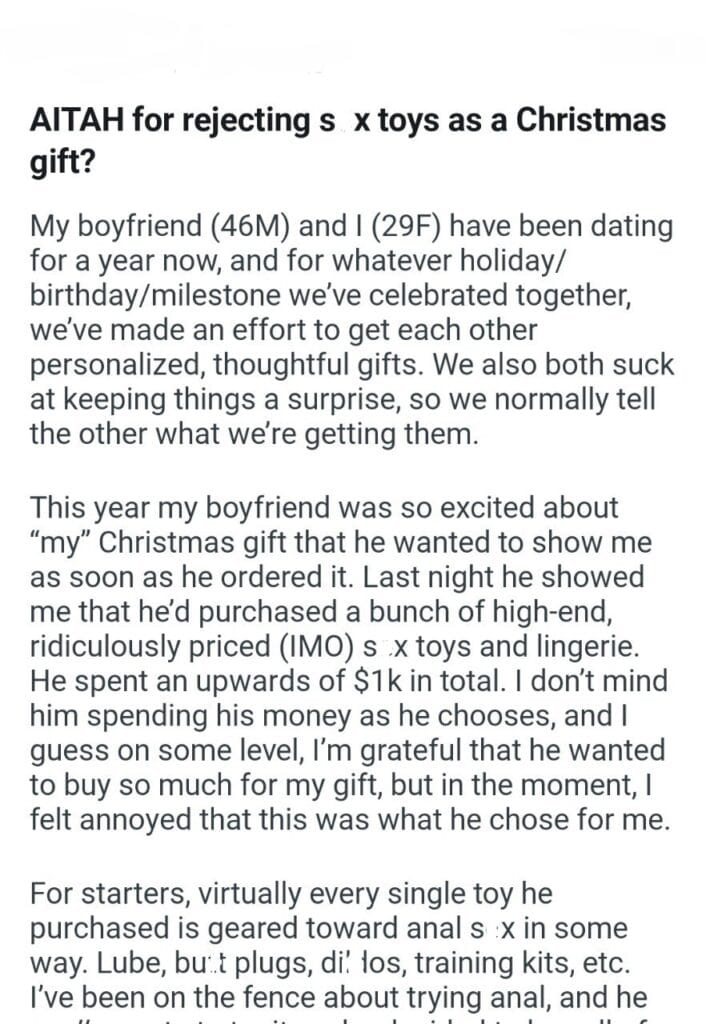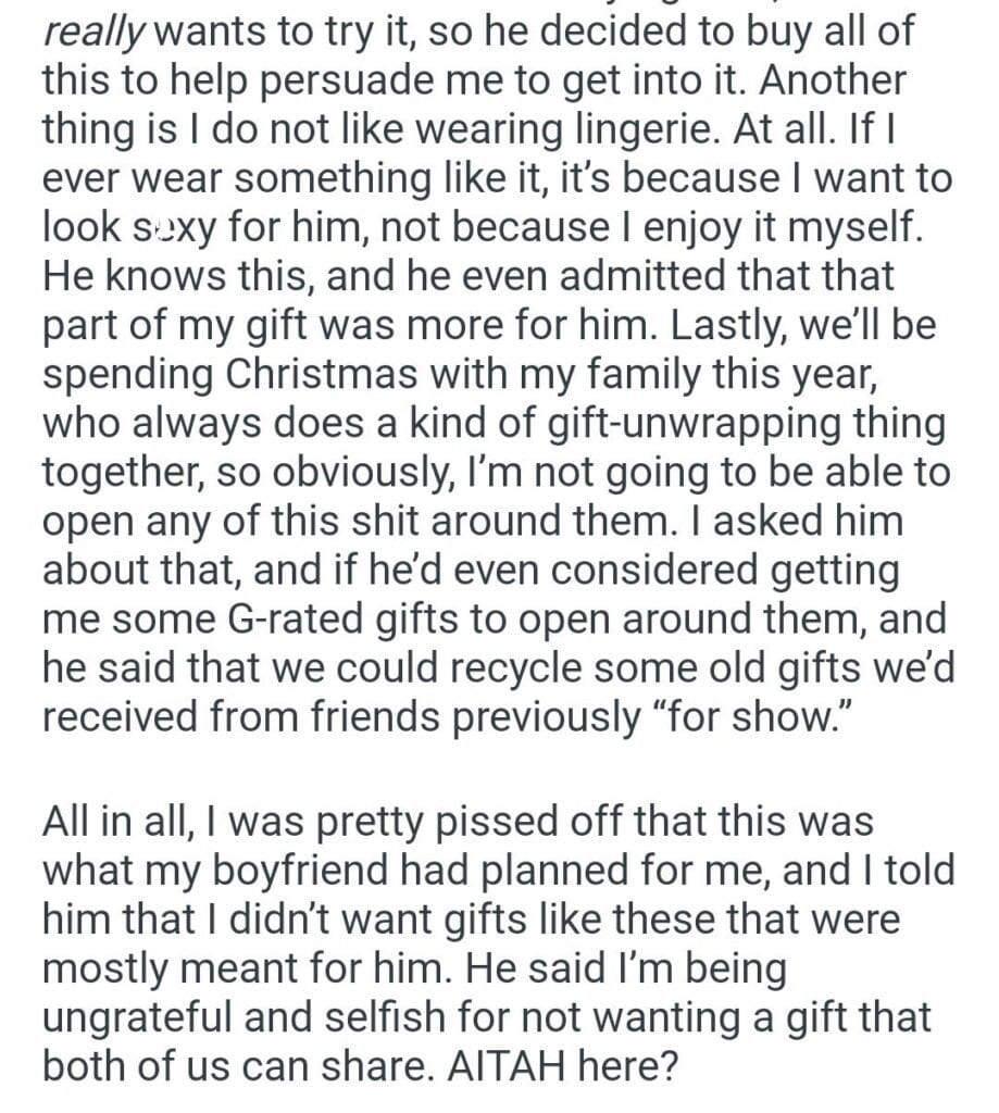 AITAH for toys as a Christmas gift? Related Posts around her husband my friend about her “boyfriend’s something vegetarian Nanny informed my husband left the office fridge everything I bought the ladder enjoying the perk my GF’s contact a wedding ring our divorce Should I leave her radio station asking my aunt