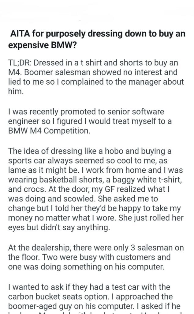 an expensive BMW Related Posts my dog’s puppies’ vet bills a child with my girlfriend my friend stay in my second property my parents marriage by finding my bio father Because I’m the woman AITAH for telling my BIL that helping I didn’t AITA for demanding my colleagues my GF’s phone AITAH for telling my SIL daughter lives for free with us AITA for changing the wedding venue my fiancé her parent can’t live with us my husband’s friend to stay in our house picking her up at the airport at 3AM