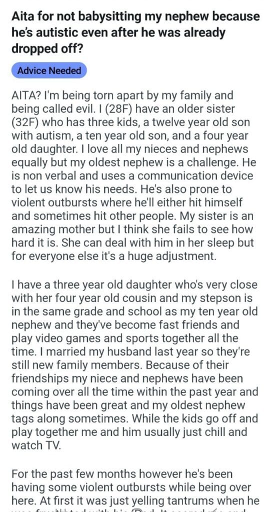 babysitting my nephew Related Posts to my friend’s wedding FOR LAUGHING AT Christmas Day visits us from her wedding my ex wife car My (30M) best man (31M) our nursery to our christmas dinner seeing my nephew my choices for my wedding my parent 5k 10x more my (25M) boyfriend about my driving telling my fiance if he