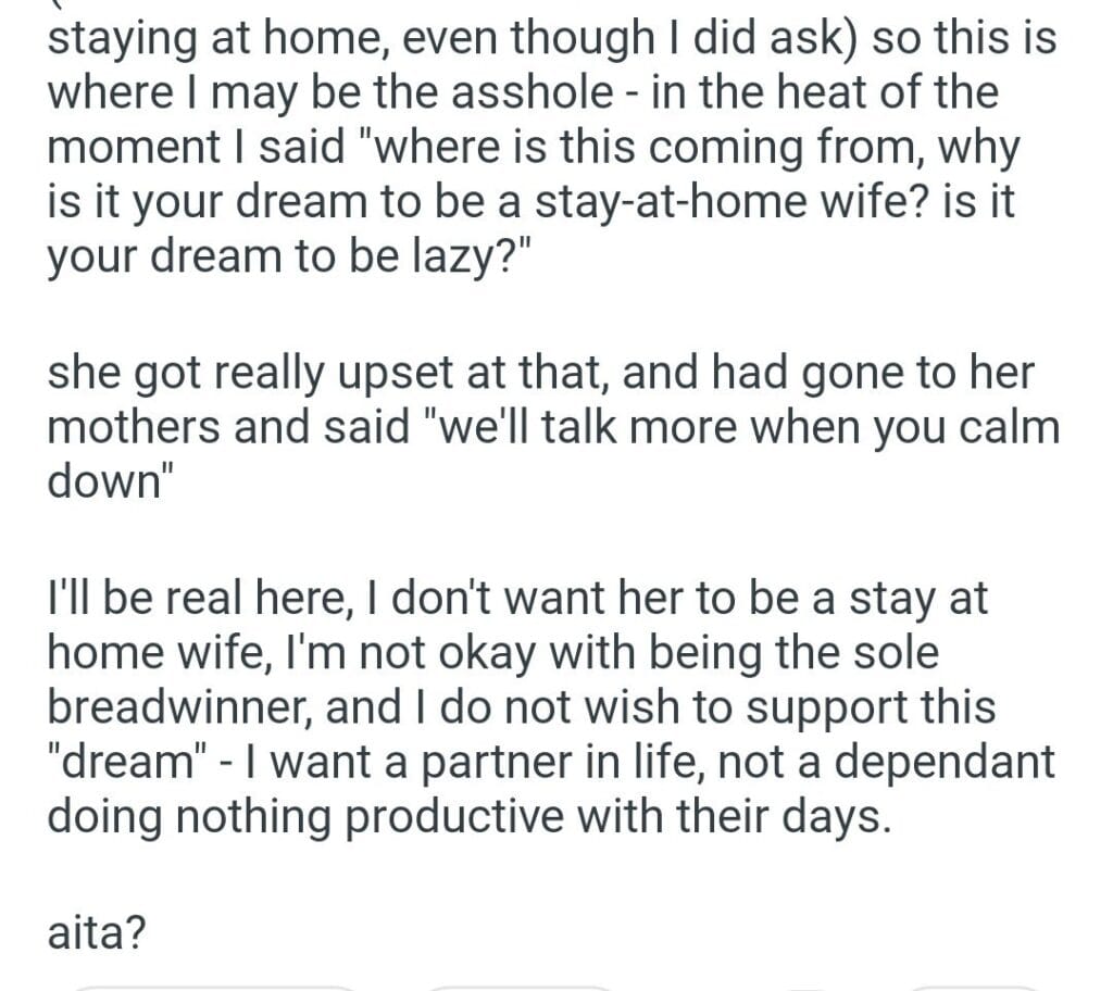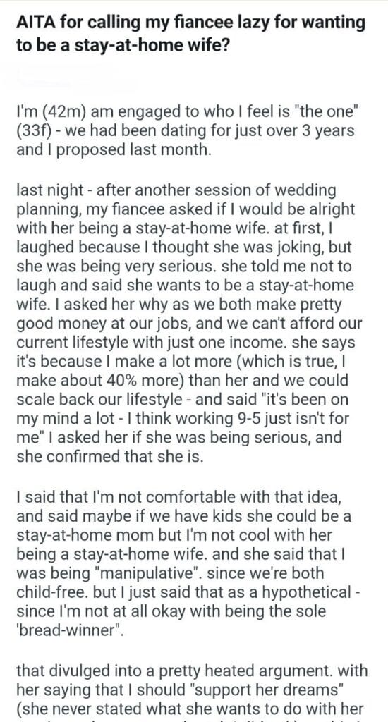 be a stay-at-home wife Related Posts name my kid my husband’s belongings changing holiday plans for saying if you my needs over my sister’s (18) boyfriend’s (18) my (35f) friend (36f) private party for calling my friend my best friend’s wedding wanting a relationship my friend for getting her own gift tags cousin deserved expensive Christmas gift