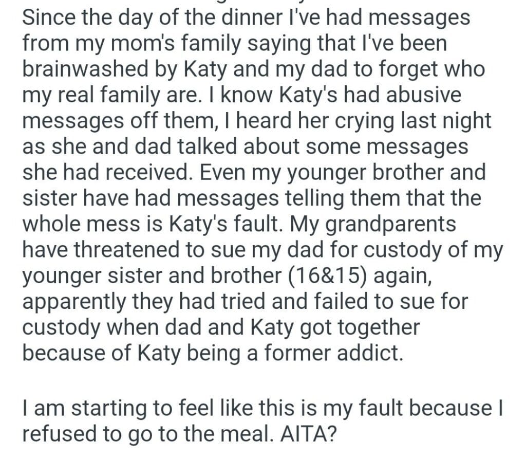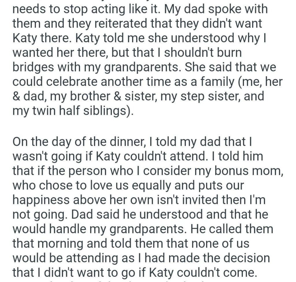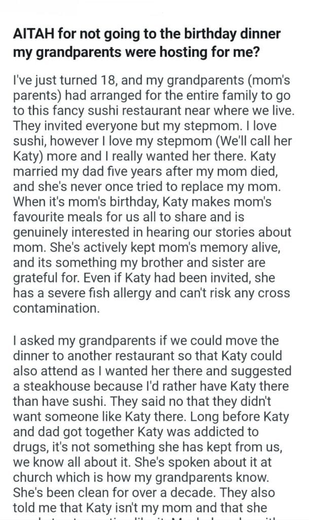 birthday dinner my grandparents Related Posts my wife (30F) My GFs friend (25F) me and her stepdaughter his inheritance to his mom Told my neighbor with my soon to be wife leaving my husband after pregnancy prank My Husband To have Access for sitting during Thanksgiving dinner telling my exes mother the meal I made our anniversary trip her friend’s kids to Thanksgiving dinner my boyfriend’s mum