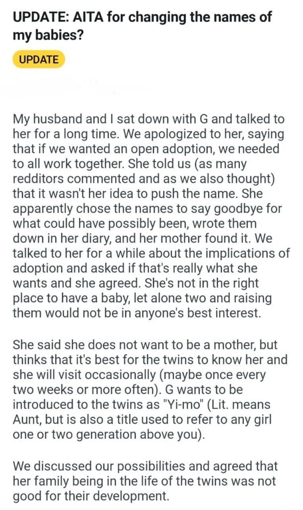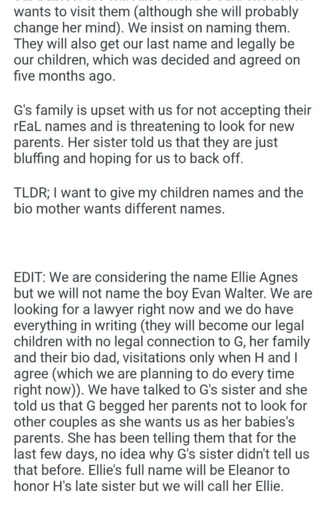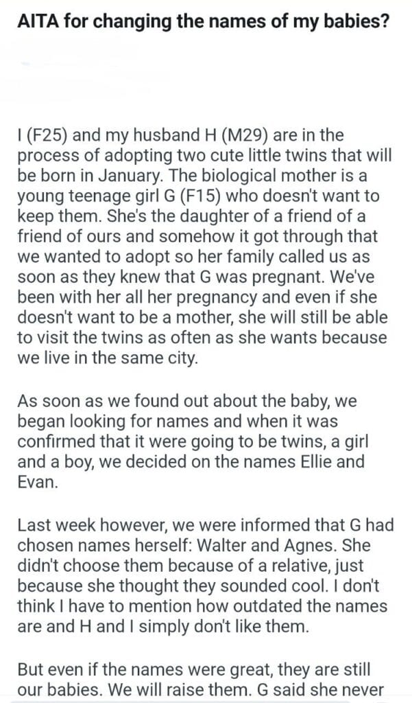 changing the names of my babies ***UPDATE Related Posts buying dishware my son’s benefits my husband gaming she’s seeing after finding out AITA for telling my husband my pregnancy snacks AIO for asking for a divorce my daughter to talk my dad and his wife’s my specific still being friends with someone a car someone gave me my BF’s best friend a facility director