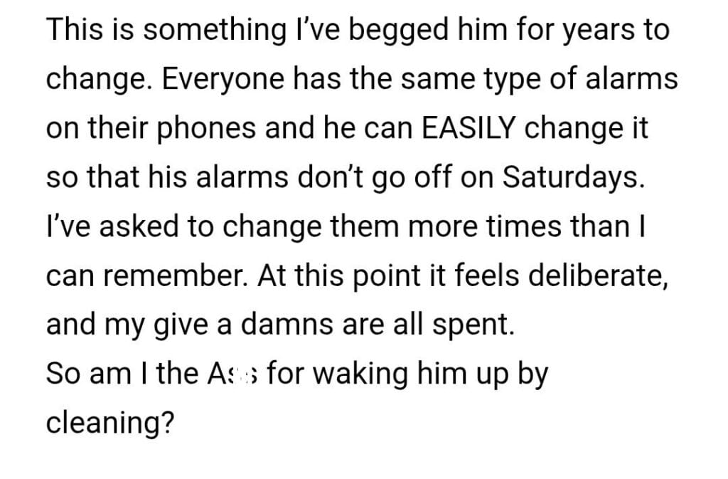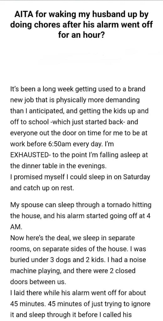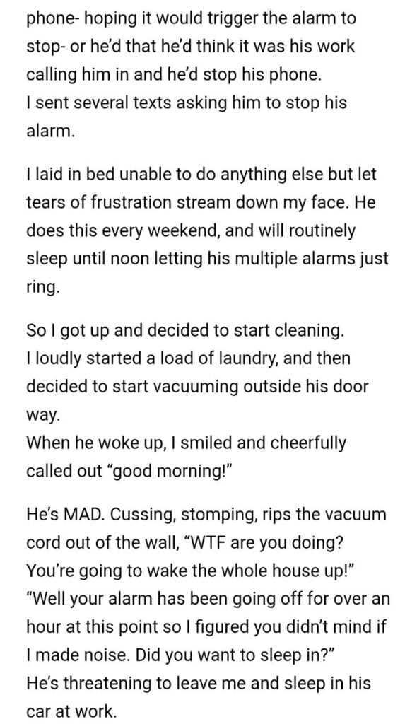 doing chores after his alarm went off Related Posts my dog’s puppies’ vet bills a child with my girlfriend my friend stay in my second property my parents marriage by finding my bio father Because I’m the woman AITAH for telling my BIL that helping I didn’t AITA for demanding my colleagues my GF’s phone AITAH for telling my SIL daughter lives for free with us AITA for changing the wedding venue my fiancé her parent can’t live with us my husband’s friend to stay in our house picking her up at the airport at 3AM