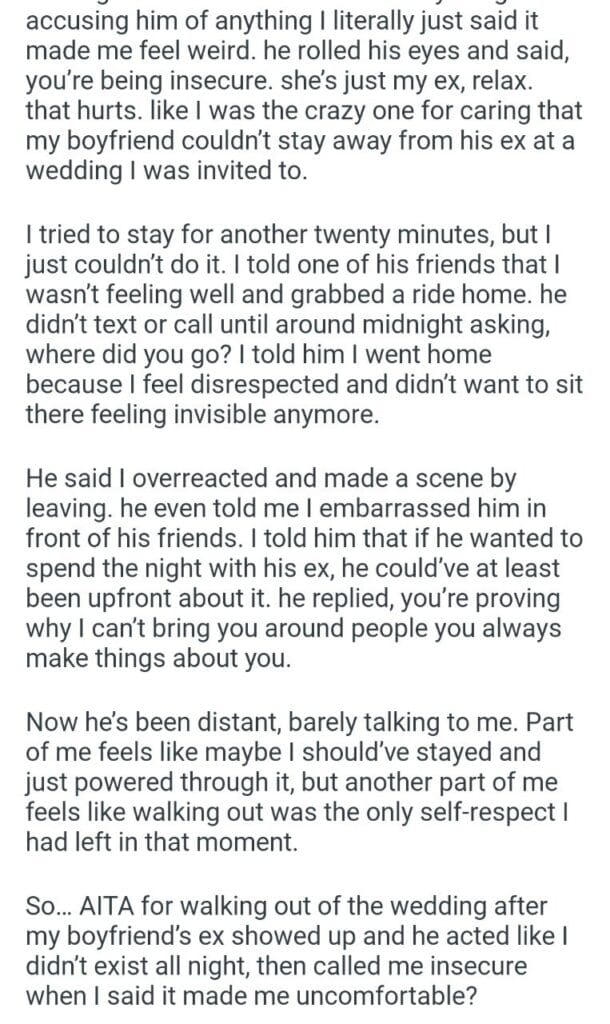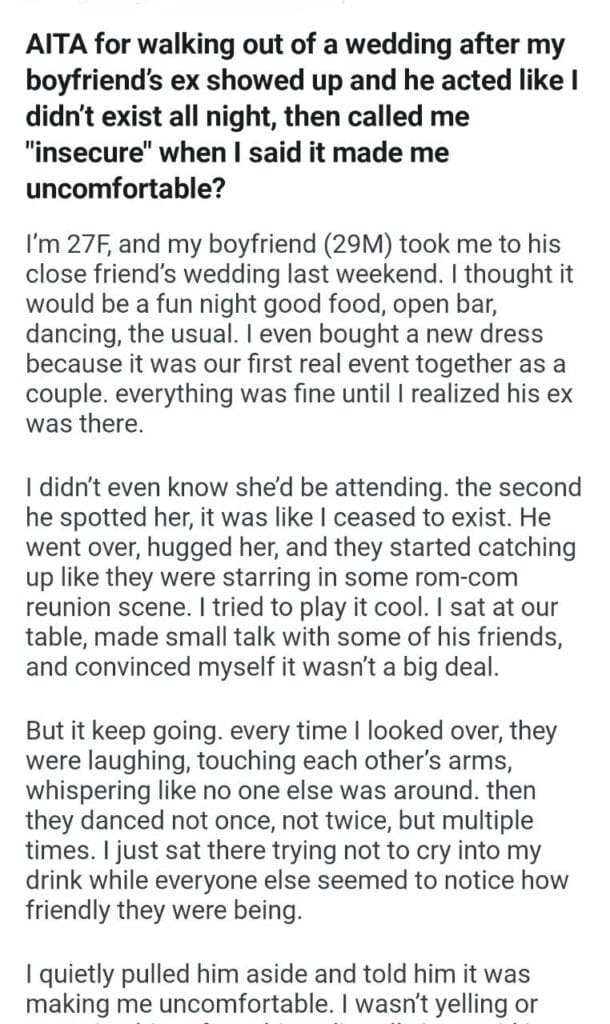ex showed up Related Posts my ex-wife’s child my fiancé’s best man leave my fiancee my 4 year old my friends kids combining income her looks tipping 83 my GF (29F) of 5 years keeping 700 my son that his cat’s my dad getting remarried some sportswear my dad’s house and telling him