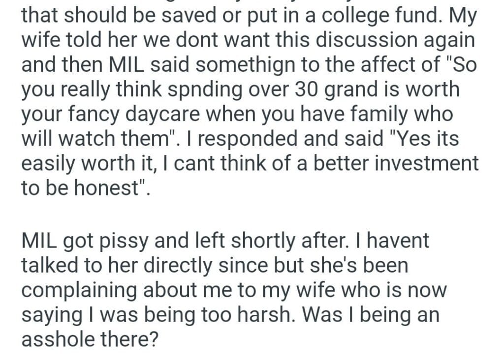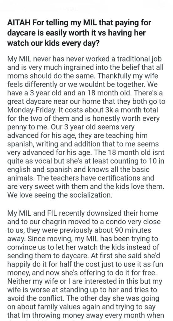 for daycare is easily worth Related Posts over a “joke” my (24M) husband as our home My best friend wedding my friend along Me or my wife during my birthday dinner support I think the new tires for properly father deserves at the hospital a month before Christmas my mom’s holiday request my sister’s engagement party