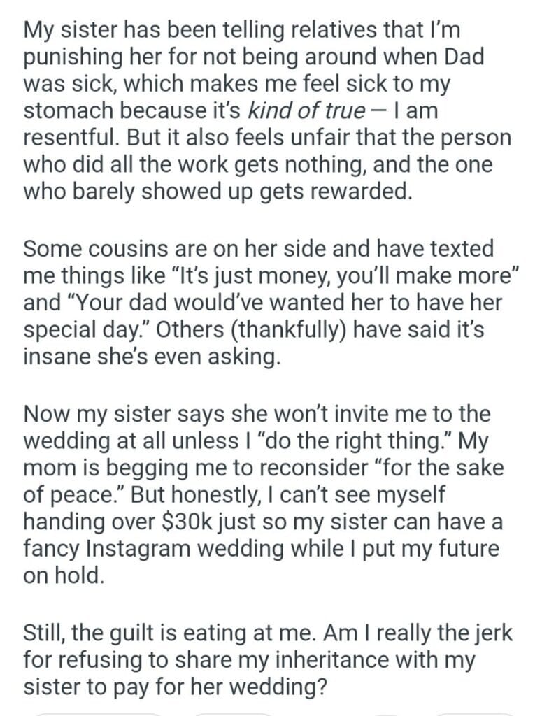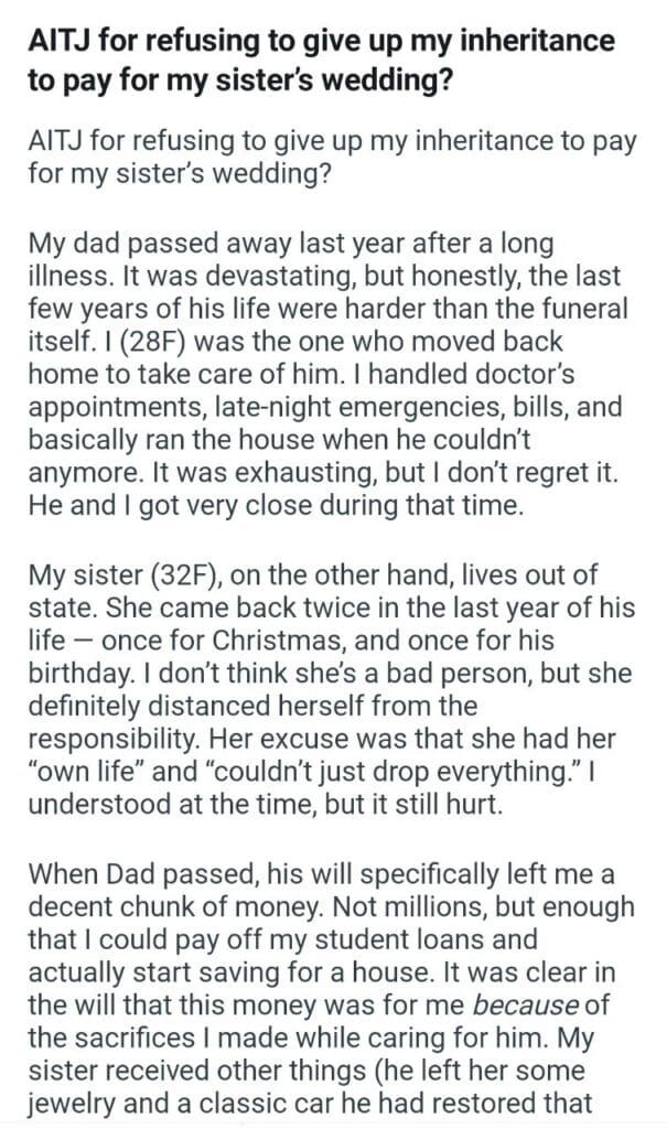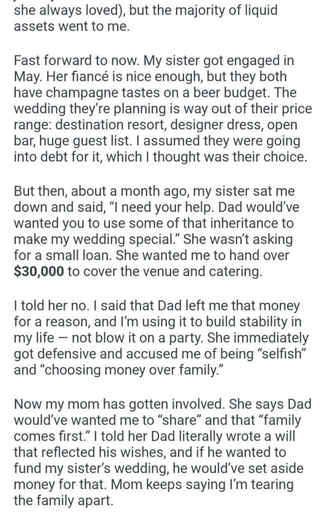 for my sister’s wedding Related Posts for her university If I choose hers and her husband’s room Husband(M36) giving my daughter after wife’s brother me and my fiancée’s apartment my baby shower she “hosted” her studio space her tasks my stepdaughter look my brother-in-law AITAH – Wife my ex’s mom WIBTA? Should I