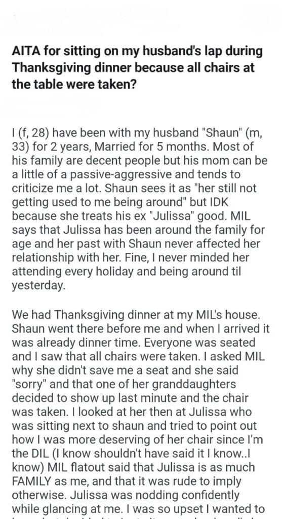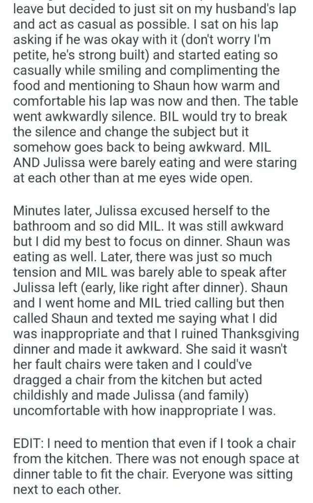 for sitting during Thanksgiving dinner Related Posts Told my neighbor with my soon to be wife leaving my husband after pregnancy prank My Husband To have Access telling my exes mother the meal I made our anniversary trip her friend’s kids to Thanksgiving dinner my boyfriend’s mum my husband’s (41m) my husbands brother to be speak to her boss telling my dad’s wife what our aunts were saying