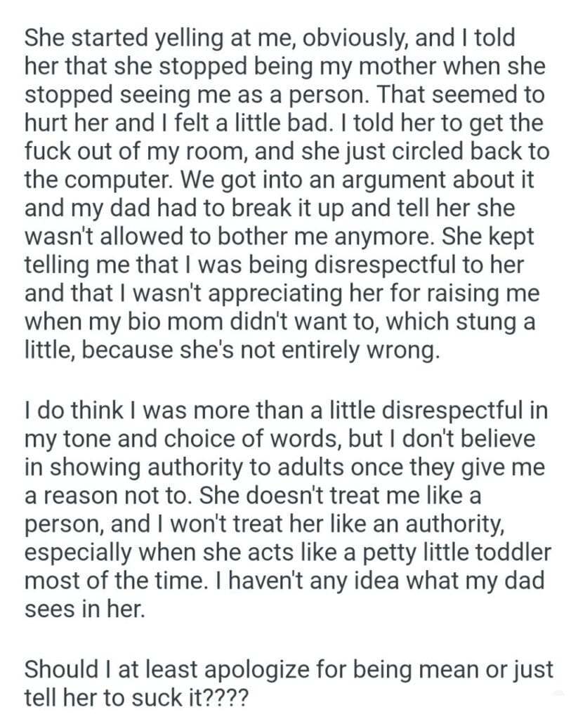 for telling my stepmom Related Posts my friend who What else can I say to my kids my girlfriend says my bf after neon green wear work clothes for telling my girlfriend my best friend and his wife to my wedding Christmas at my in-laws for my MIL the wedding dress code babysit my sister’s kids my “perfect” husband my friend replace