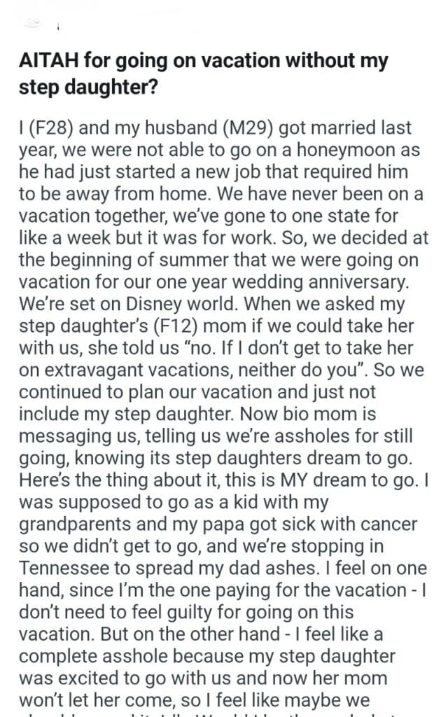 going on vacation Related Posts after what the waitress did entertain some kid she lives with me my younger sister asking my best friend aitah for divorcing my husband over his mother makes over a sock asking a pregant woman I don’t understand my kids nanny from her best friend divorce if my husband giving my housemate been the same since