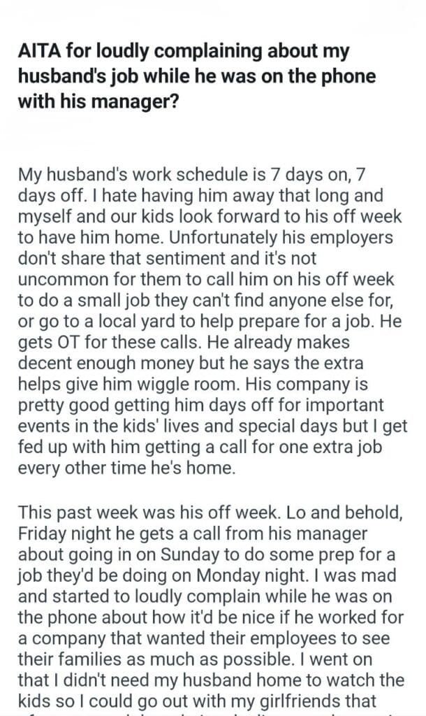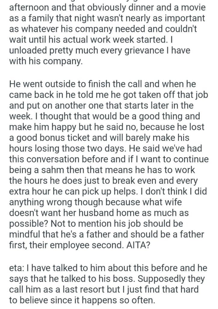 he was on the phone with his manager Related Posts AITA for telling my husband my friend mom acts moving to another country long time ago before marriage for adopting a kitten my son half sister’s birthday party my roomate all night HER KIDS DREW ON MY WALLS my bf if he doesn’t propose moving to the other side of the world AITA for telling my dad “I’m officially my mom’s wife as a parent my husband’s sister take the daughter my child from playing video games AITA for asking my wife to make dinner