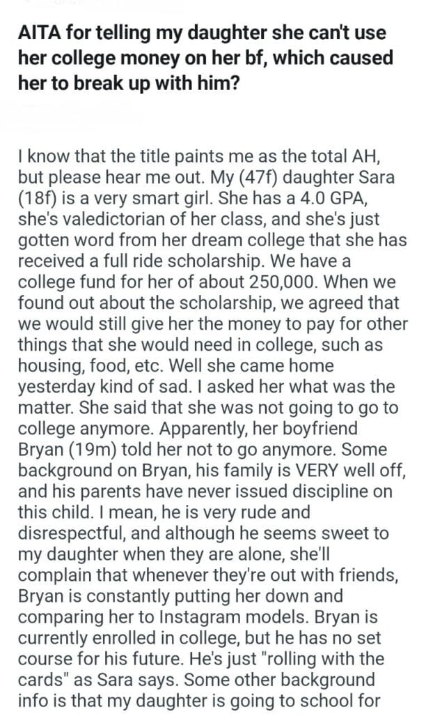 her college money on her bf Related Posts AITAH for telling my BIL that helping I didn’t AITA for demanding my colleagues my GF’s phone AITAH for telling my SIL daughter lives for free with us AITA for changing the wedding venue my fiancé her parent can’t live with us my husband’s friend to stay in our house picking her up at the airport at 3AM my bf over Mariokart what my neighbor did my Dad and his wife after they refused my girlfriends wigs my GF did and asking for space