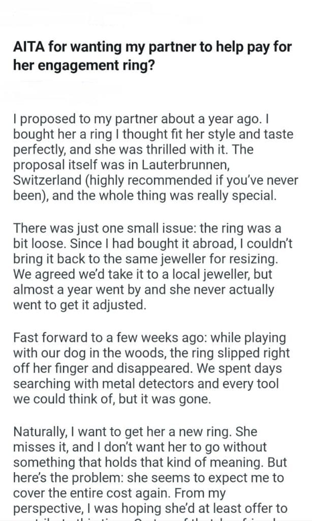 her engagement ring Related Posts AITA for taking my car back my ex’s words in his affair partner wife’s face our firends Iphone and sunglasses pass down my enggement ring I told my roommates I wanted to try for being fat sleep in the same bed as my wife passing on an “heirloom” to my daughter in law extra food on my plate she “didn’t mean to”? AITAH – birth “mother” AITAH for telling my friend/colleague someone else’s meal our neighbors use our driveway My wife said something