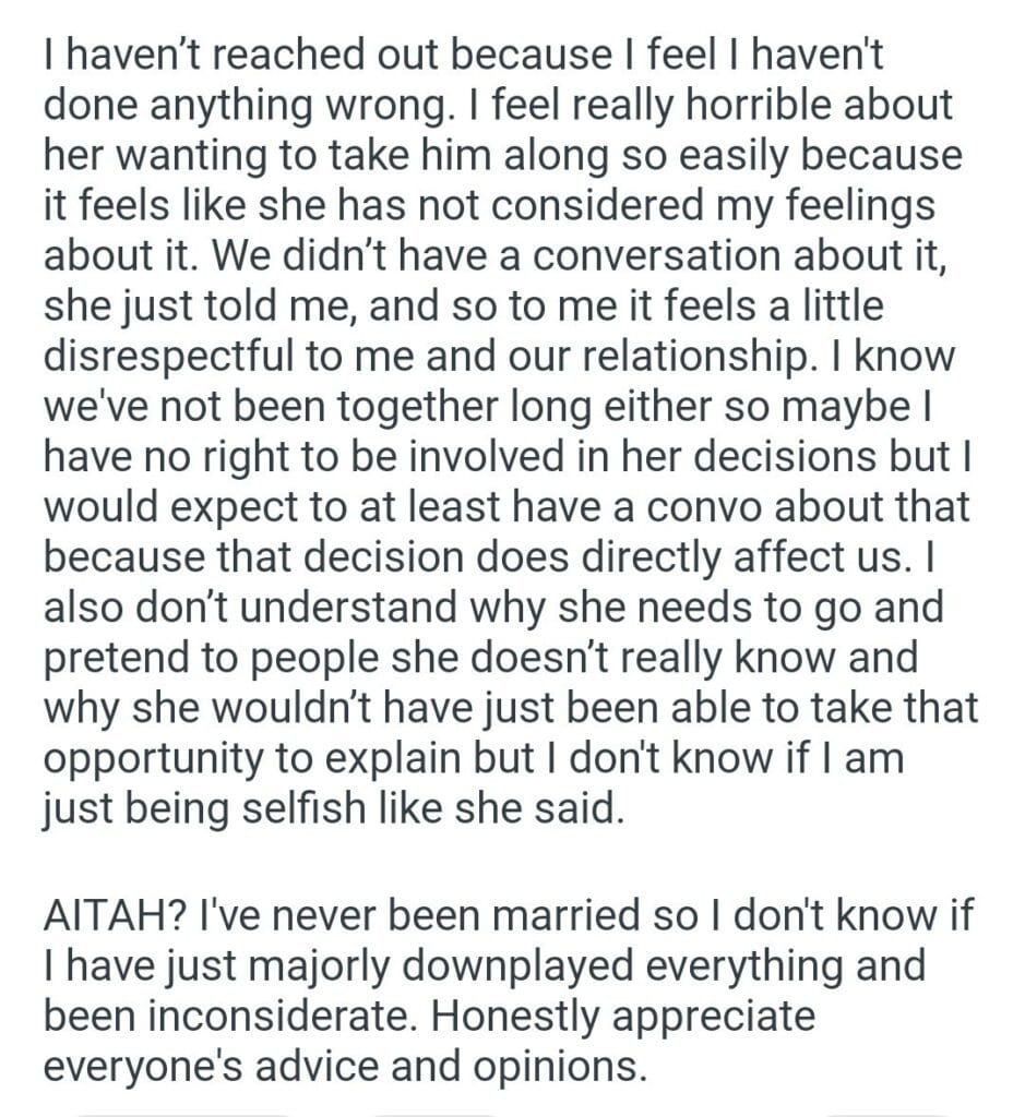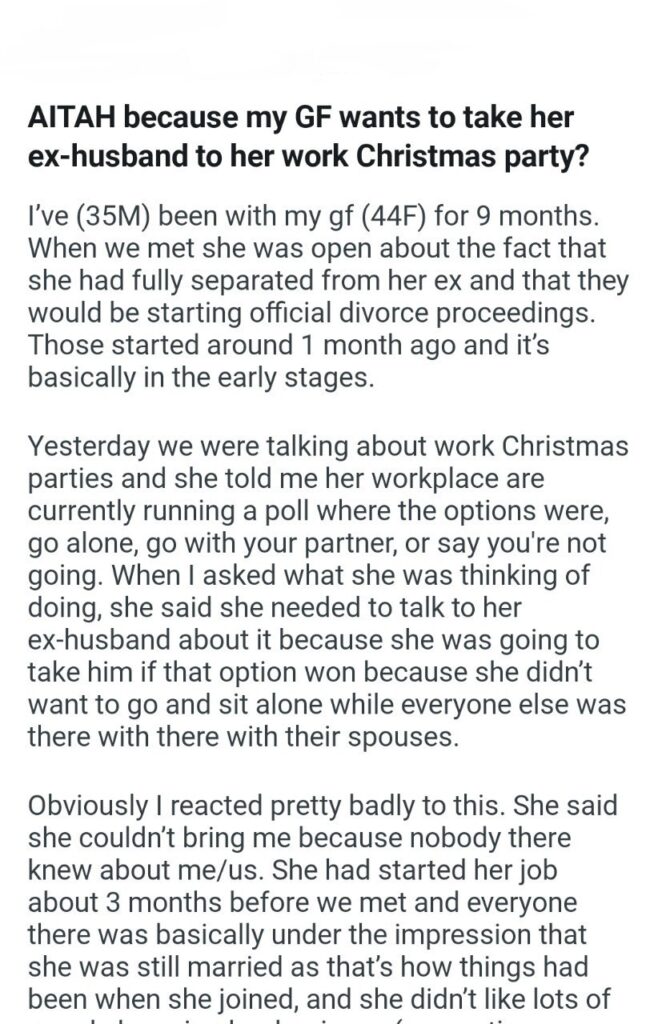 her work Christmas party Related Posts my bf going to a Halloween party my partner’s my parents support Husband [29M] to specifically learn I’m changing my name my fiancé (m33) my best friend after the way I the baby monitor on for saying I will divorce my husband 600 a month attend family gatherings My husband’s son (28M) to friendsgiving