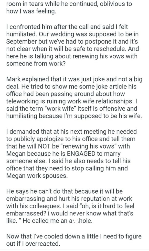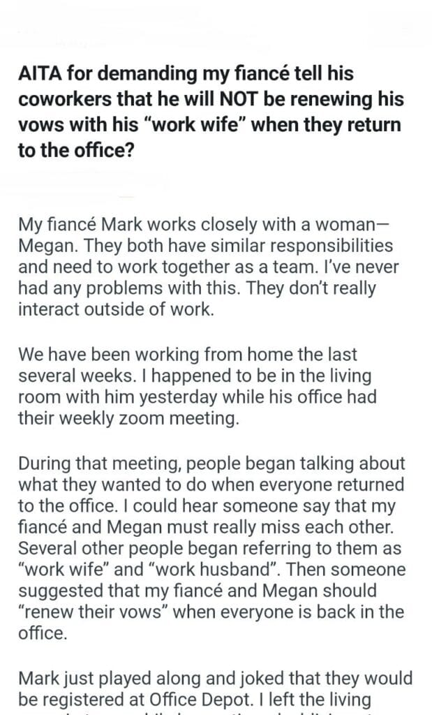 his vows with his “work wife Related Posts my dog’s puppies’ vet bills a child with my girlfriend my friend stay in my second property my parents marriage by finding my bio father Because I’m the woman AITAH for telling my BIL that helping I didn’t AITA for demanding my colleagues my GF’s phone AITAH for telling my SIL daughter lives for free with us AITA for changing the wedding venue my fiancé her parent can’t live with us my husband’s friend to stay in our house picking her up at the airport at 3AM