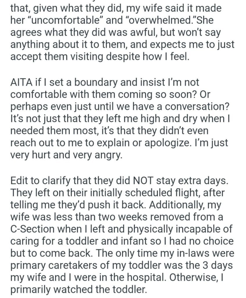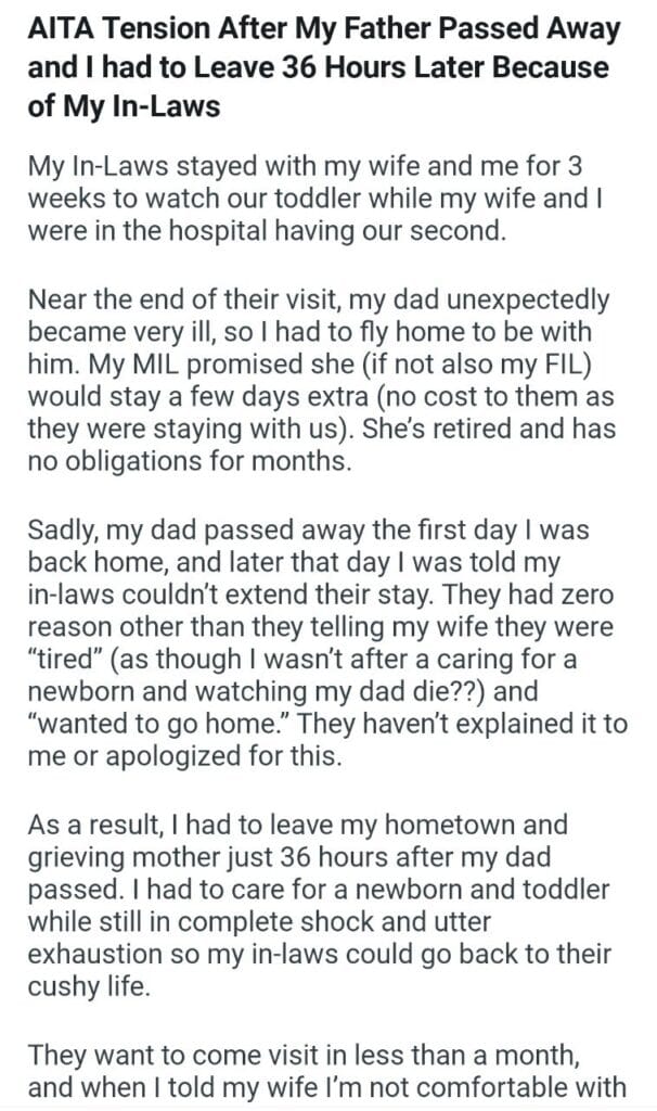 I had to Leave 36 Hours Later Because of My In-Laws Related Posts my dog’s puppies’ vet bills a child with my girlfriend my friend stay in my second property my parents marriage by finding my bio father Because I’m the woman AITAH for telling my BIL that helping I didn’t AITA for demanding my colleagues my GF’s phone AITAH for telling my SIL daughter lives for free with us AITA for changing the wedding venue my fiancé her parent can’t live with us my husband’s friend to stay in our house picking her up at the airport at 3AM