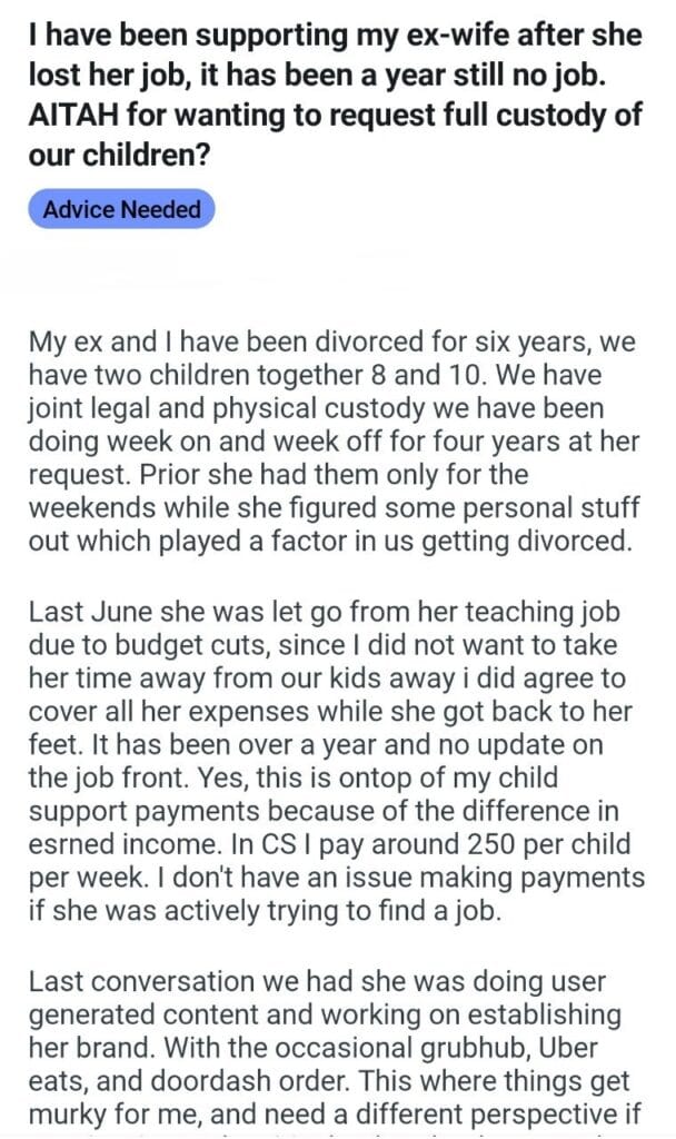 I have been supporting my ex-wife Related Posts Because I’m the woman AITAH for telling my BIL that helping I didn’t AITA for demanding my colleagues my GF’s phone AITAH for telling my SIL daughter lives for free with us AITA for changing the wedding venue my fiancé her parent can’t live with us my husband’s friend to stay in our house picking her up at the airport at 3AM my bf over Mariokart what my neighbor did my Dad and his wife after they refused my girlfriends wigs