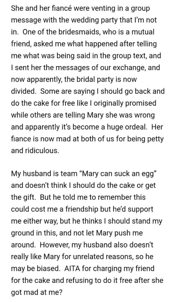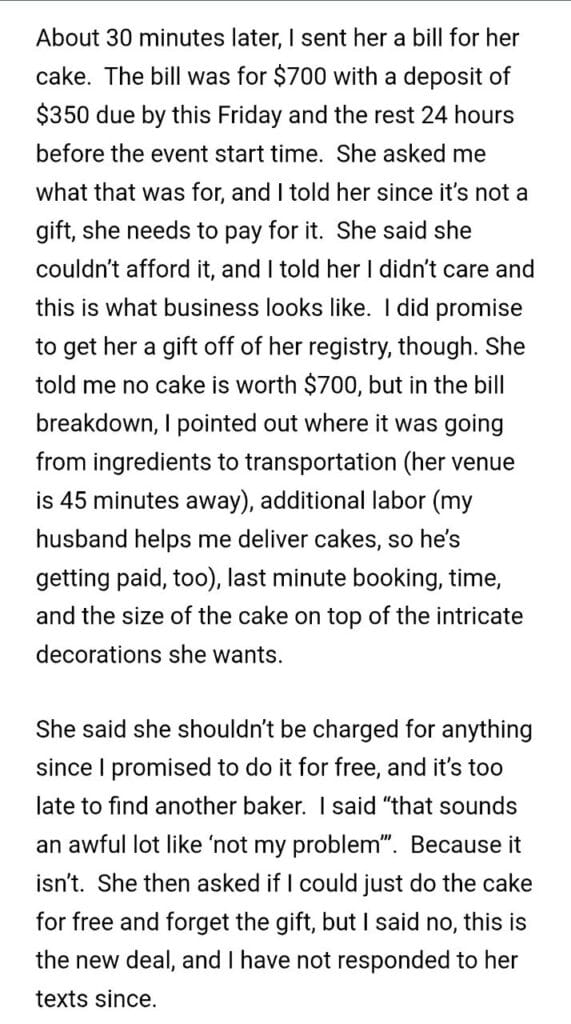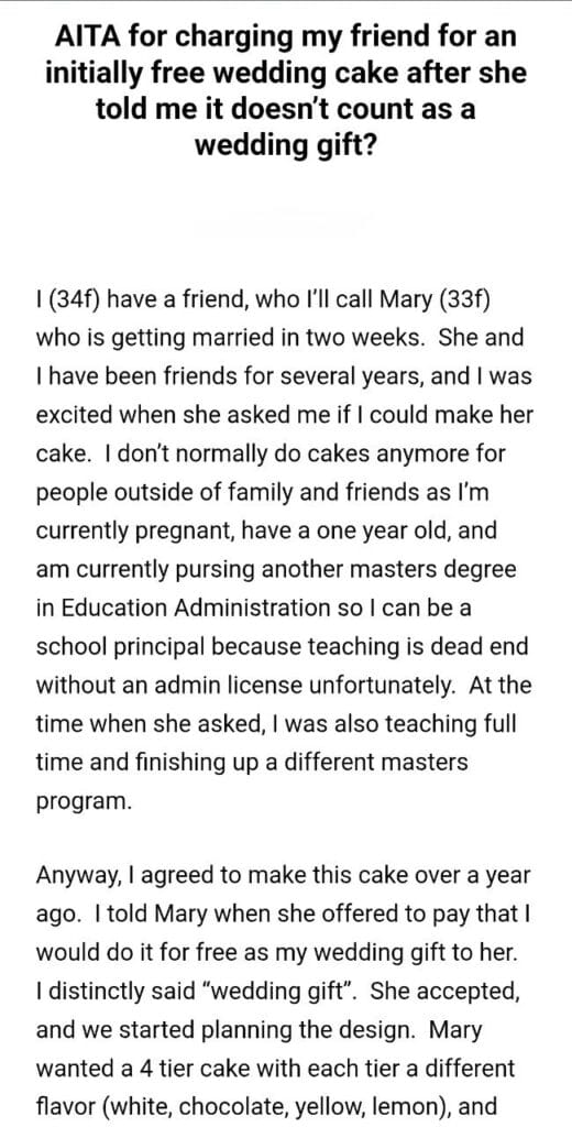 initially free wedding cake Related Posts my dog’s puppies’ vet bills a child with my girlfriend my friend stay in my second property my parents marriage by finding my bio father Because I’m the woman AITAH for telling my BIL that helping I didn’t AITA for demanding my colleagues my GF’s phone AITAH for telling my SIL daughter lives for free with us AITA for changing the wedding venue my fiancé her parent can’t live with us my husband’s friend to stay in our house picking her up at the airport at 3AM