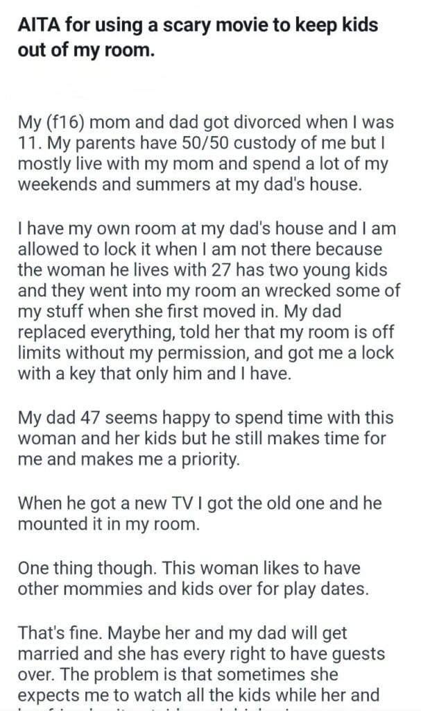 keep kids out of my room Related Posts my dog’s puppies’ vet bills a child with my girlfriend my friend stay in my second property my parents marriage by finding my bio father Because I’m the woman AITAH for telling my BIL that helping I didn’t AITA for demanding my colleagues my GF’s phone AITAH for telling my SIL daughter lives for free with us AITA for changing the wedding venue my fiancé her parent can’t live with us my husband’s friend to stay in our house picking her up at the airport at 3AM