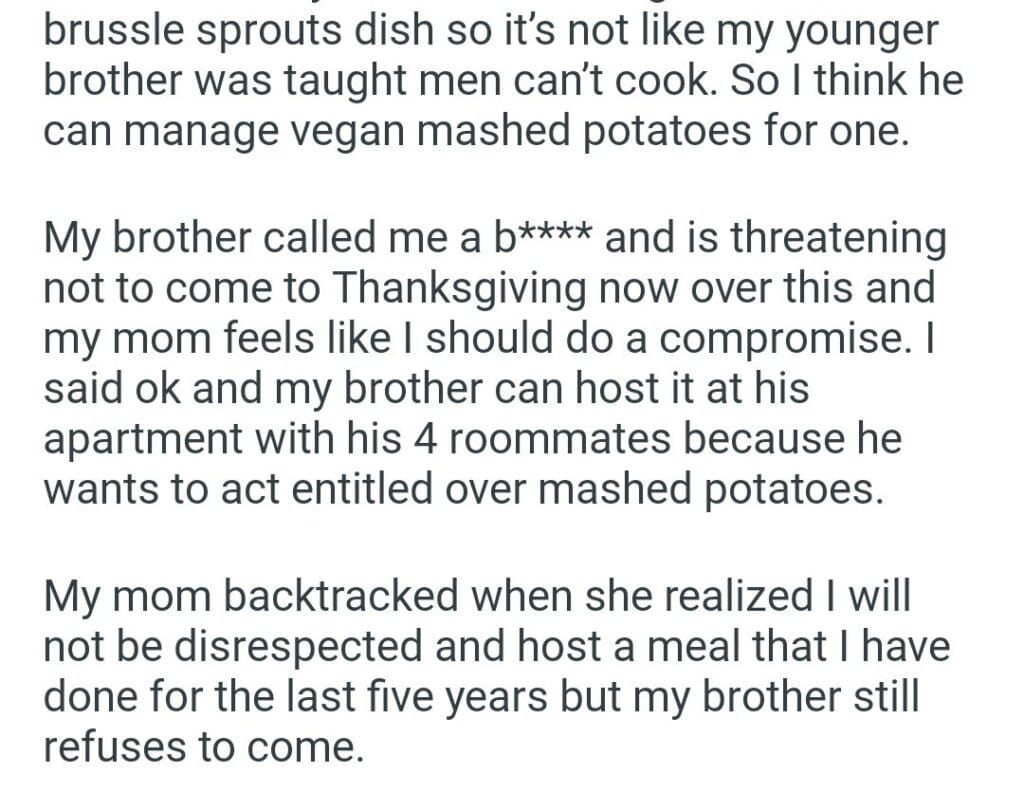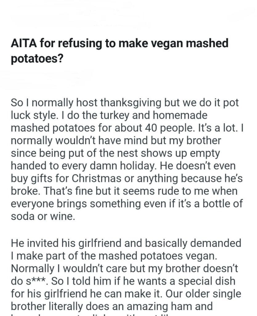 mashed potatoes Related Posts the new tires for properly father deserves at the hospital a month before Christmas my mom’s holiday request my sister’s engagement party leaving my bf My neighbor that the reason five years later overnight visitors birthday bbq my son (18) my (29m) online my inlaws’ christmas
