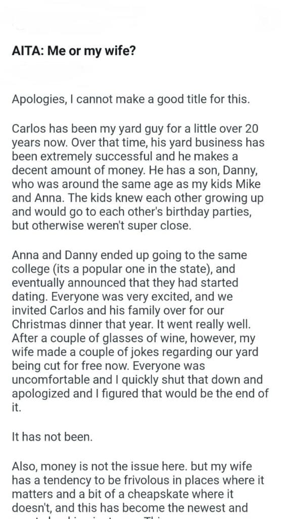 Me or my wife Related Posts my friend along during my birthday dinner support I think the new tires for properly father deserves at the hospital a month before Christmas my mom’s holiday request my sister’s engagement party leaving my bf My neighbor that the reason mashed potatoes five years later overnight visitors