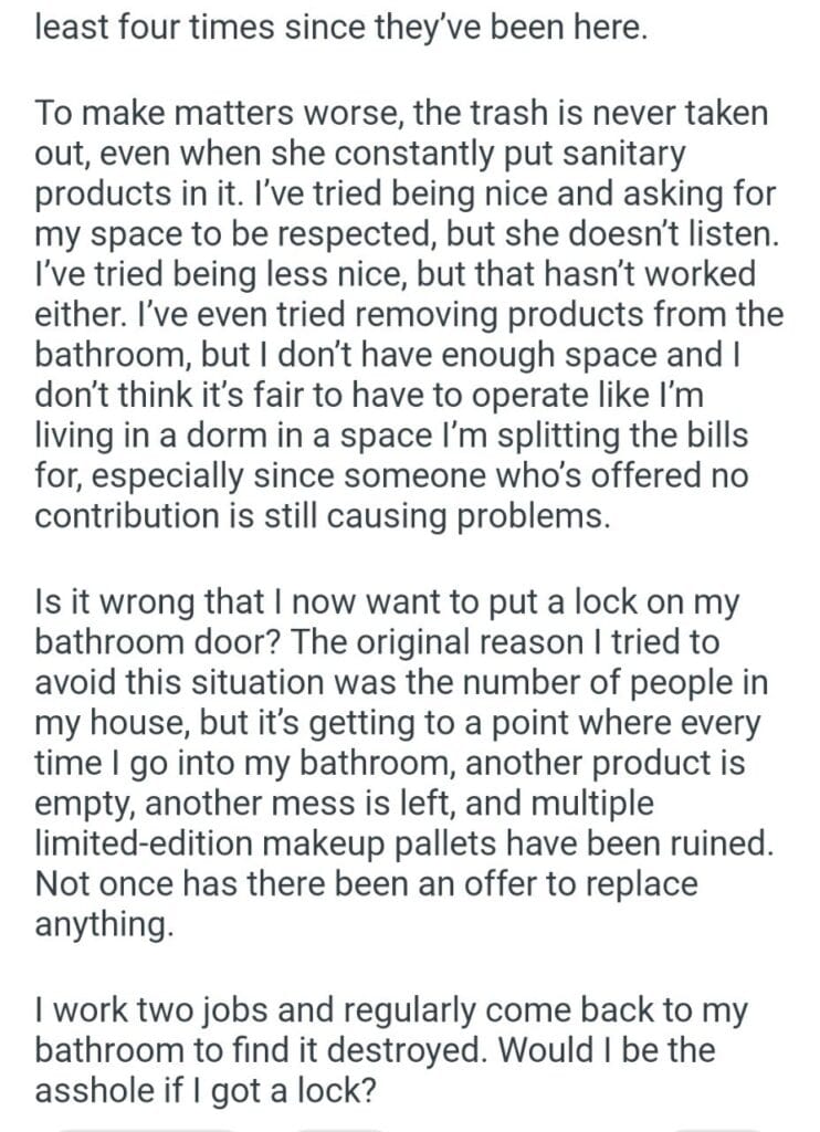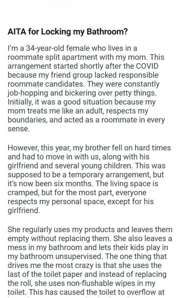 my bathroom Related Posts dog for my Daughter reporting a teacher my property for not speaking Call Animal Control sister of my father’s not judgement she doesn’t want to move in my neighbors and telling them to get divorced good friend AITA for telling my neighbor without telling AIO my boyfriend lunch at work the same elevator when my baby