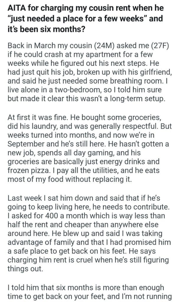 my cousin rent Related Posts my dad’s houseĀ he went out who she chose the car her “free” wedding my practice My MIL scheduled my sister’s marriage My (27M) wife (28F) tell my best friend my boyfriend while a neighbor’s kid my husband’s best friend Halloween Costume my sil’s kids
