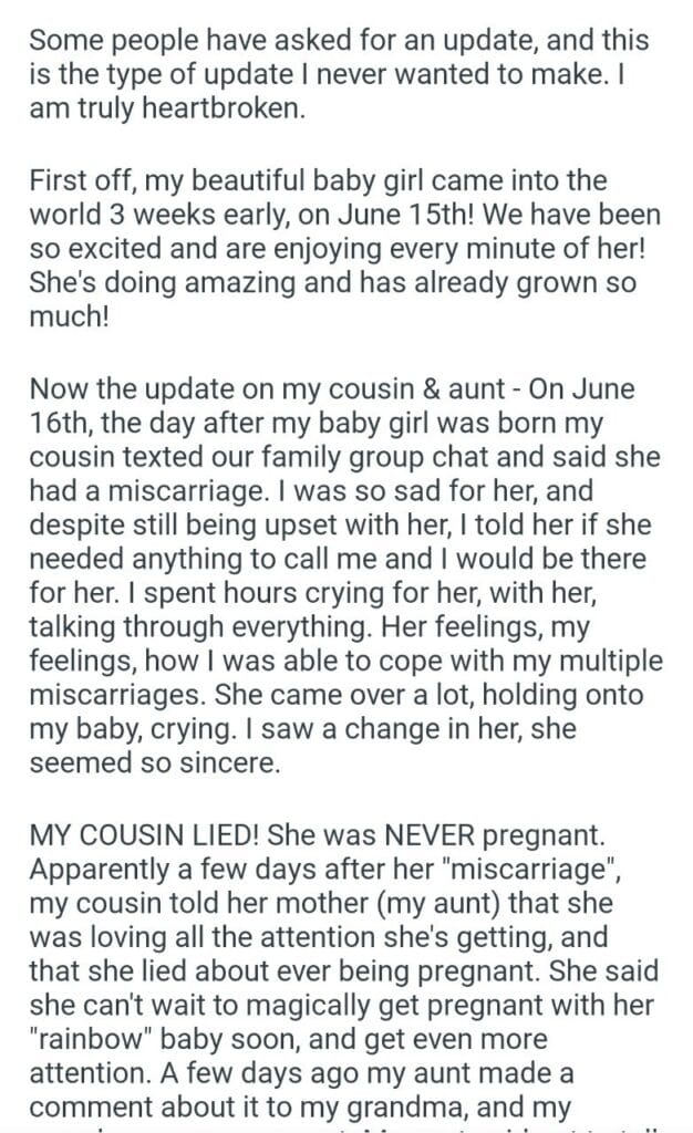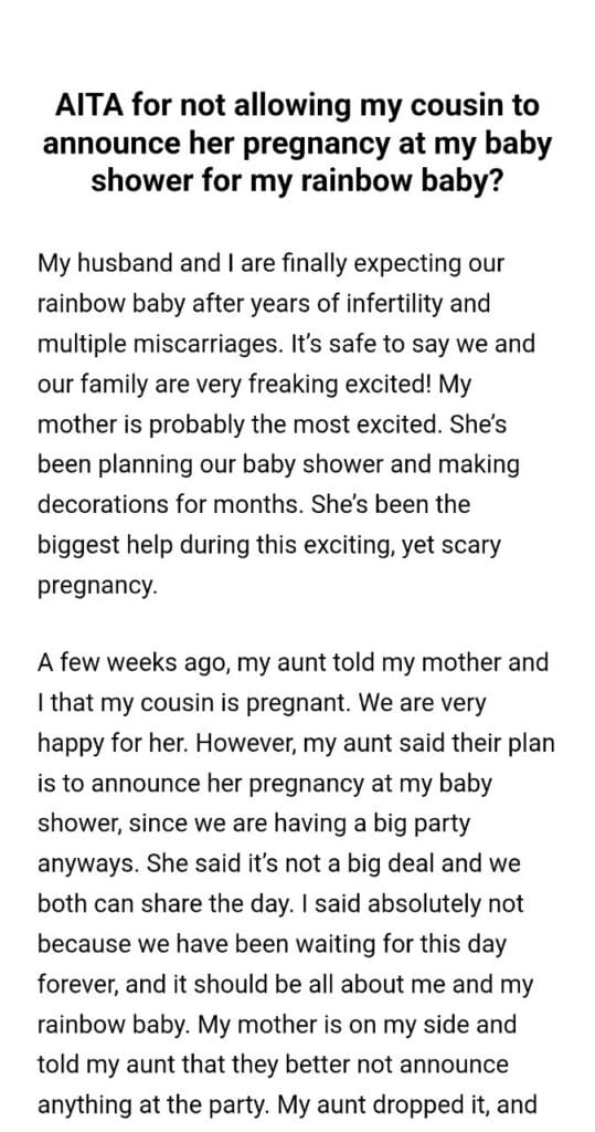 my cousin to announce her pregnancy ***UPDATE Related Posts AITA- I called my sis my girlfriends dogs my baby for my dogs my girlfriend’s birthday AITA for telling my roommate AITAH for telling my wife why my gf for having AITA for saying my wife my childcare job I told my friend why for how I handled AITAH for asking MIL AITA for wanting to divorce my husband for responding to a SIL’s