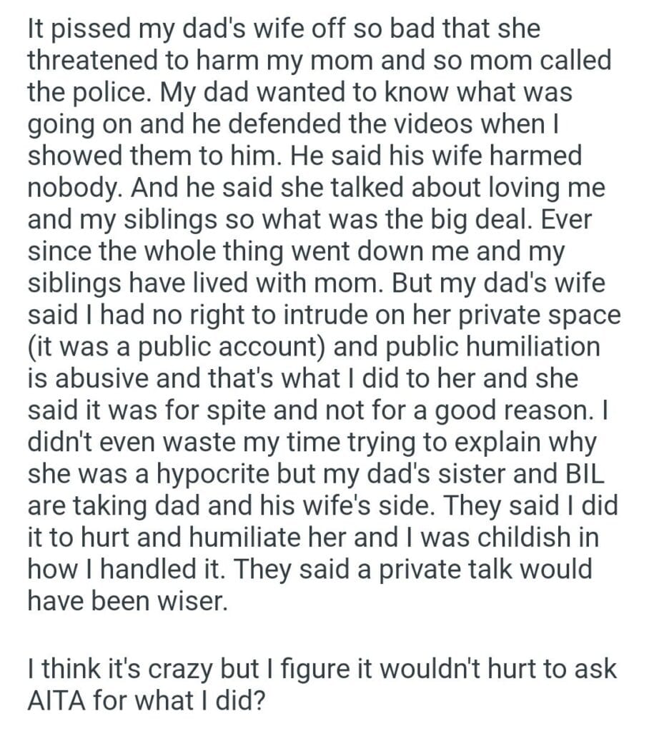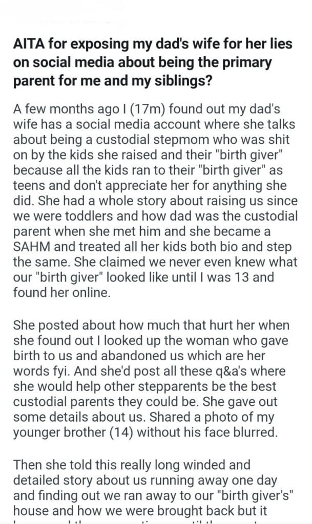 my dad’s wife Related Posts friend’s daughter her company’s annual cousin’s pregnant gf even though I’ve always boss’s PTO knit at work my personal needs for what her grandparents said wife’s espresso giving my husband food babysit my sister’s kid a text I sent WIBTA if I called telling my friend’s bf say in this part