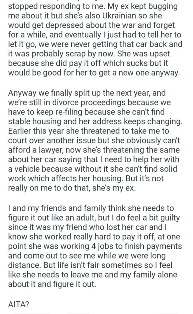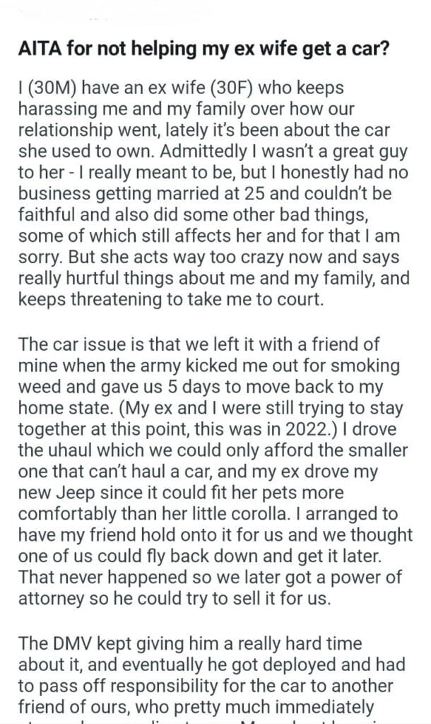 my ex wife car Related Posts Christmas Day visits us from her wedding My (30M) best man (31M) our nursery to our christmas dinner seeing my nephew my choices for my wedding my parent 5k 10x more my (25M) boyfriend about my driving telling my fiance if he from my Sisters in laws my friends toddler my dad’s Christmas party