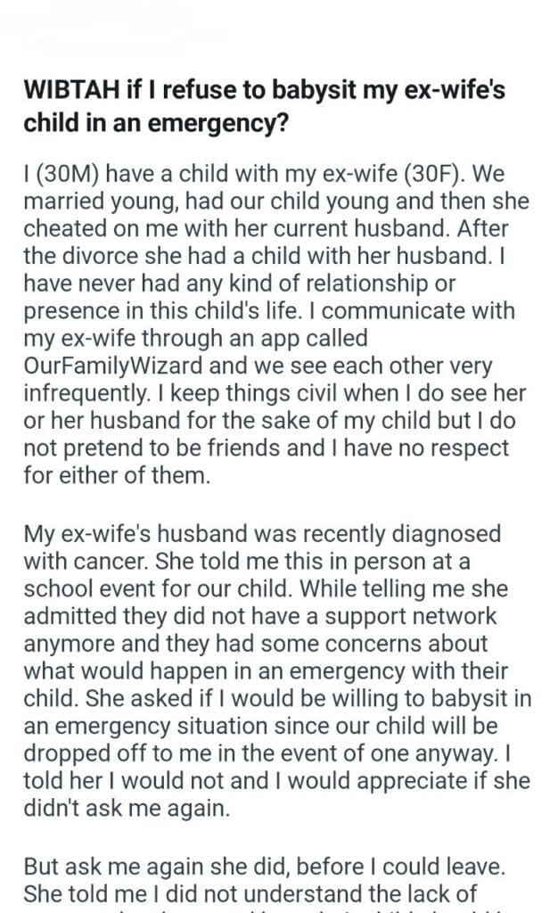 my ex-wife’s child Related Posts ex showed up my fiancé’s best man leave my fiancee my 4 year old my friends kids combining income her looks tipping 83 my GF (29F) of 5 years keeping 700 my son that his cat’s my dad getting remarried some sportswear my dad’s house and telling him