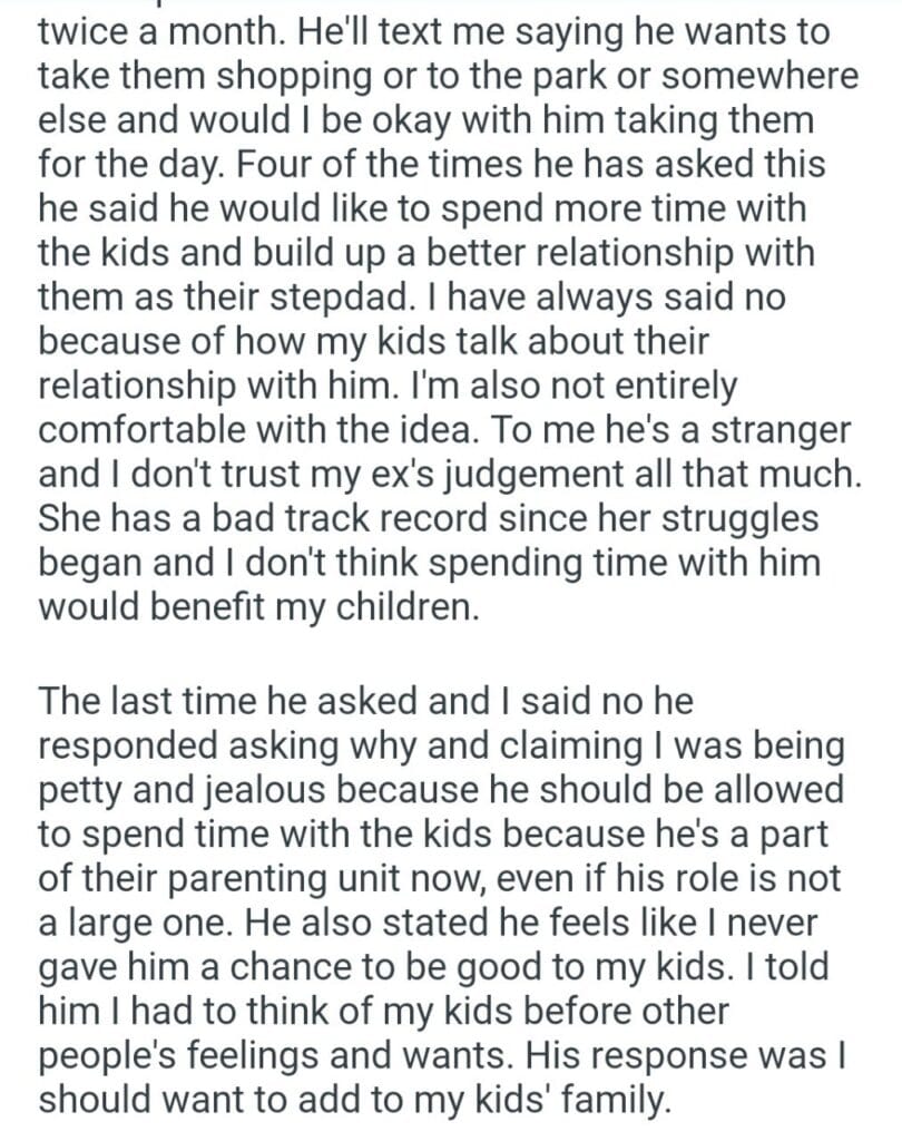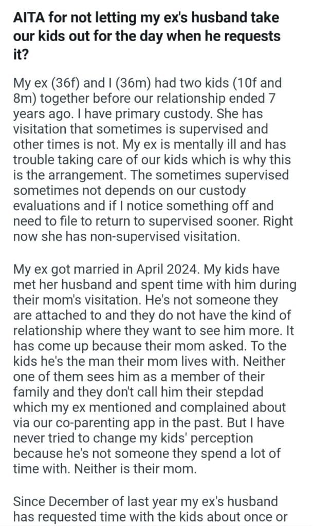 my ex’s husband take our kid Related Posts My entire family her service dog my parent face his part time job with my wife something my wife did my girlfriend she’s being present for a baby family trip right after when my husband asks me my MIL from my wedding my stepkids accounts with my little sister my stepdaughter suggestion taking the kids to my parents