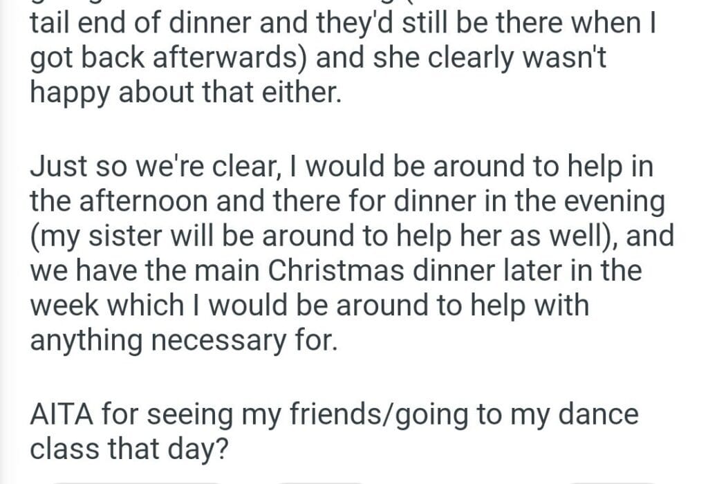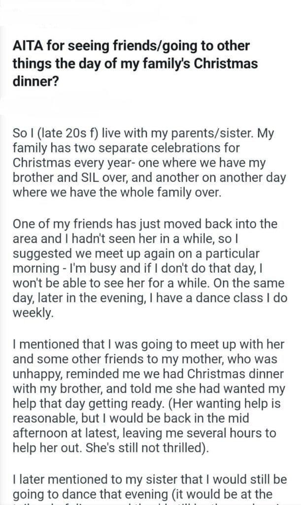 my family’s Christmas dinner Related Posts making rules my sister wear my mom’s wedding dress my DIL she wasn’t invited a kid’s Christmas calling my sil because of my looks when she gets married my car for work her best friend’s husband below my apartment my boyfriend after he chose me my SIL’s Christmas gift list how they treated me at my husband Christmas for my kids