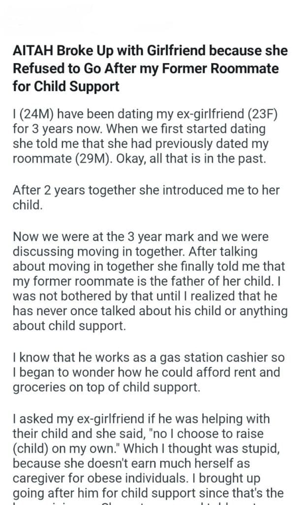 my Former Roommate for Child Support Related Posts my dog’s puppies’ vet bills a child with my girlfriend my friend stay in my second property my parents marriage by finding my bio father Because I’m the woman AITAH for telling my BIL that helping I didn’t AITA for demanding my colleagues my GF’s phone AITAH for telling my SIL daughter lives for free with us AITA for changing the wedding venue my fiancé her parent can’t live with us my husband’s friend to stay in our house picking her up at the airport at 3AM