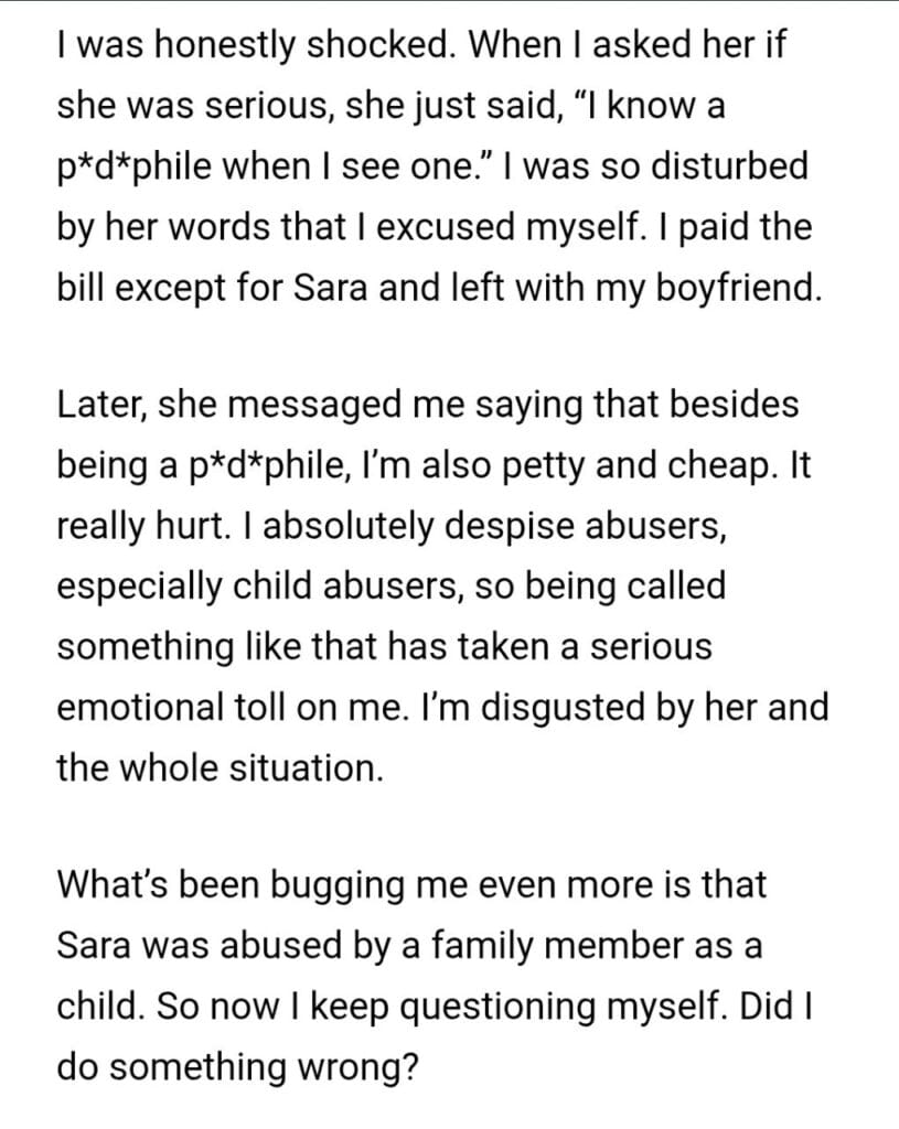 my friend’s dinner Related Posts friendly conversations while we were separated my bridal party Visiting My GF while my roommate my mom’s bf my neighbors dog My man found My (27F) boyfriend (30M) after he said something she said she understood my sister’s wedding the baby shower surprise my son’s stepbrother telling my fiance